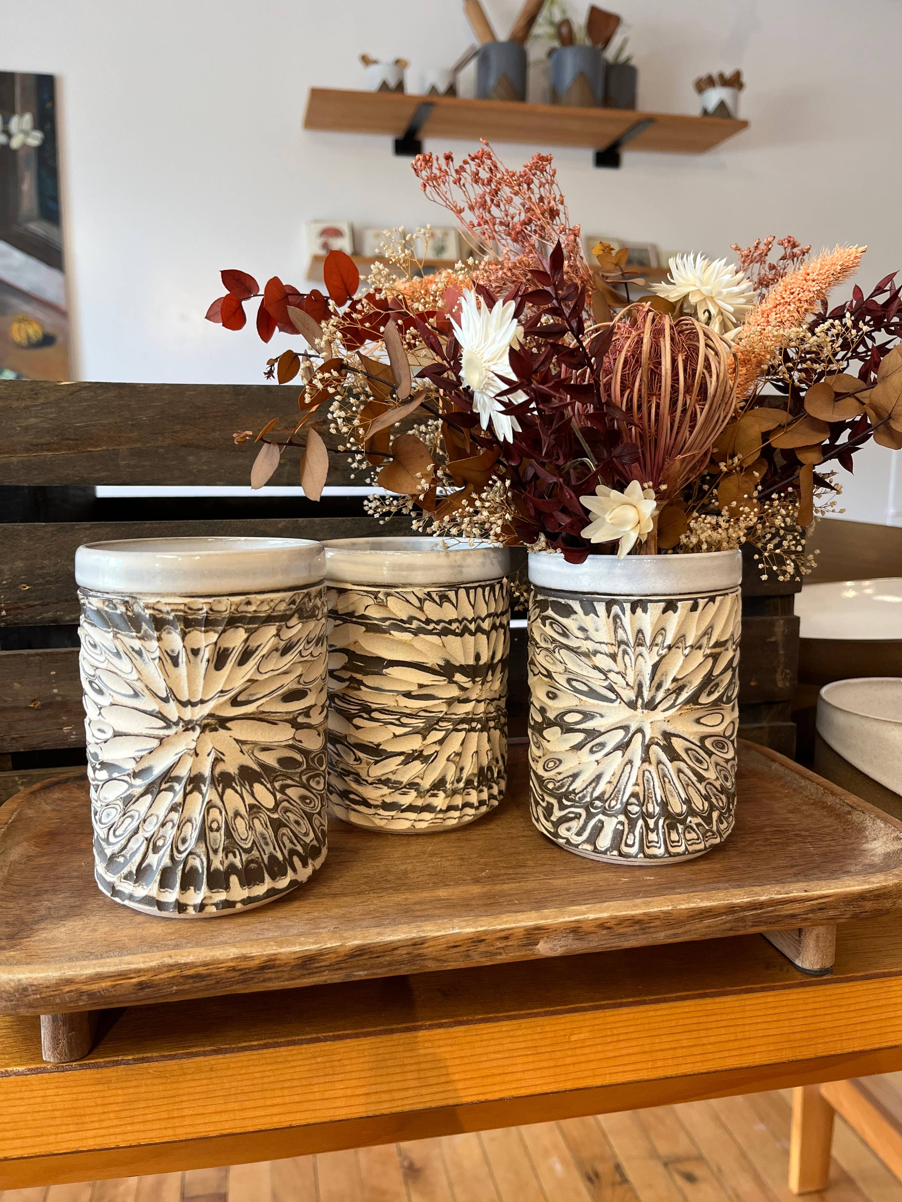 Butterfly Effect series now available in planters. Thrown from marbled black and white stoneware clay these pieces will complement any plant you pair with them. Includes drainage with a matching white glazed drainage dish. Available in two sizes : Small: Height 4 inches, Width: 4 inches Large: Height: 4.75 inches, Width: 5.25 inches