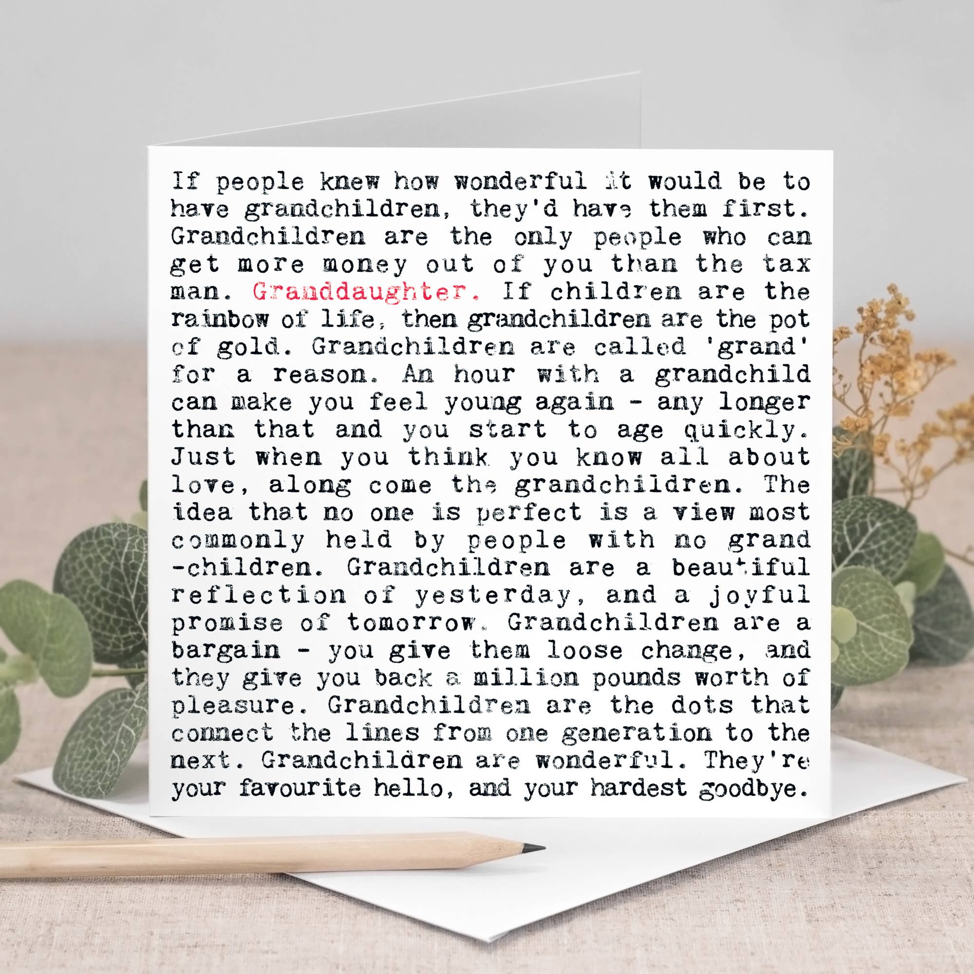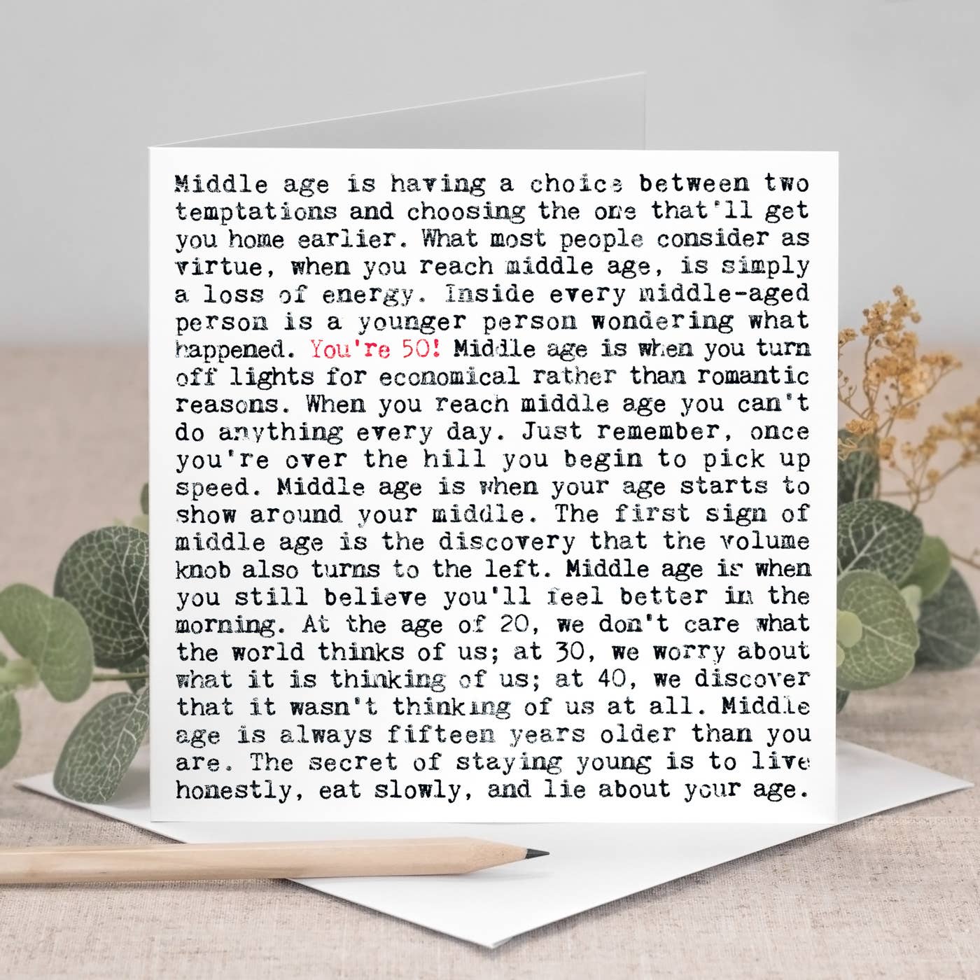 Uncoated heavyweight textured matt card. Quotes are in a distressed typewriter-style font. Blank on the inside. Square: 15x15cm. Envelope colour: white. From Coulson Macleod's best-selling 'Wise Words' range.