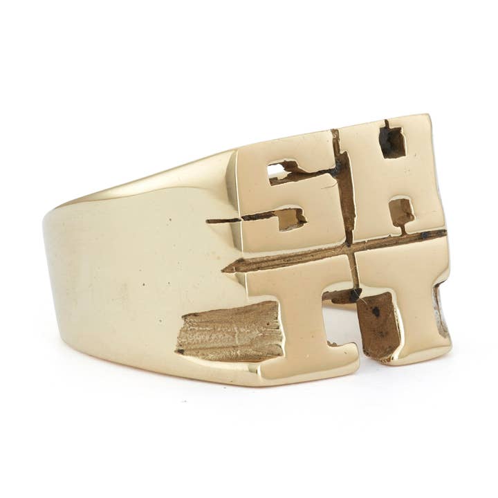 Snash Jewelry nameplate rings are available in sizes 5-9. Brass rings are uncoated, allowing for customer re-polishing. Avoiding water, heavy lotions, chlorine, etc., will prolong the original polished shine. Cleaning the ring with a jewelry polishing cloth will restore shine if tarnish occurs.