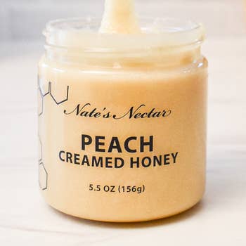 Peach, with its connotations of fresh starts and happiness in your palm, is on trend, and we're bringing it to you in an exciting new way...in a jar! We've never seen so many of our fans choose a new favorite so quickly - Peach Vanilla Honey Cream Spread! Our sweet spread has a smooth natural peach front note, followed by vanilla and caramel flavors. No preservatives or artificial flavors used. Yummy on pancakes, a warm biscuit, French toast, goat cheese, roasted chicken or pork, nut butter sandwiches, a summery cocktail....even a spoon! Refrigerate after opening.