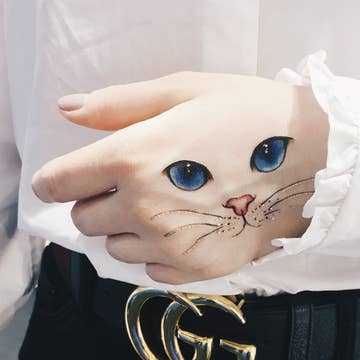 Cat Temporary Tattoo Realistic tattoo design Long lasting Perfect for any occasion Designed in London Easy to apply: - Cut out the desired design - Peel off the plastic - Place design face down onto clean skin - Wet with water and peel paper off! Ta dah! To remove: - Soak tattoo with baby oil, or oil based make up remover, to allow the adhesive to dissolve.  - After 10 seconds, remove the oil with a cotton pad. - Be gentle when removing, do not rub the skin hard particularly around the eye area. Each pack contains 2 sheets of design Metallic and colour, 4" x 4".