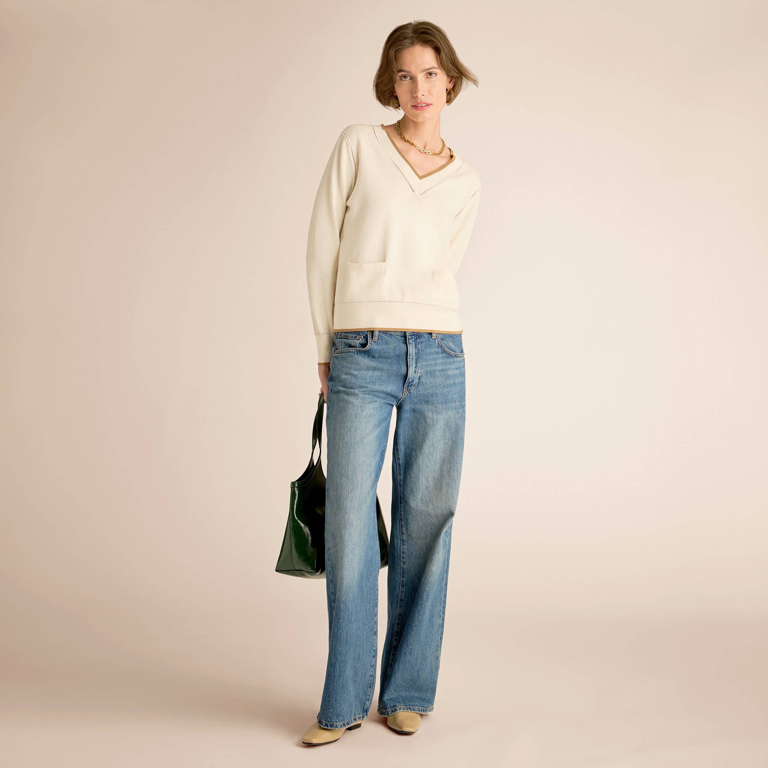 * Cable v-neck jumper in mustard * Easy boxy shape * Contrast hem details * British made * This style is oversized in shape. If you prefer a neater fit, you may want to try the size smaller An easy boxy fit jumper with dropped shoulders and playful contrasting tipping details, the Emma V neck cable knit jumper is an effortless staple to elevate your wardrobe. In a mid-weight knit, Emma brings you a unique mix of cable and stitching creating a flattering yet striking look. Featuring 3 different styles of stitches and 3 scales of the prettiest of cables, the subtle changes between the detail adds depth and texture. Made exclusively in the UK, layer over your midi dress for a softer look, or style with leather look trousers & sliders for a smarter feel. The length of this style of