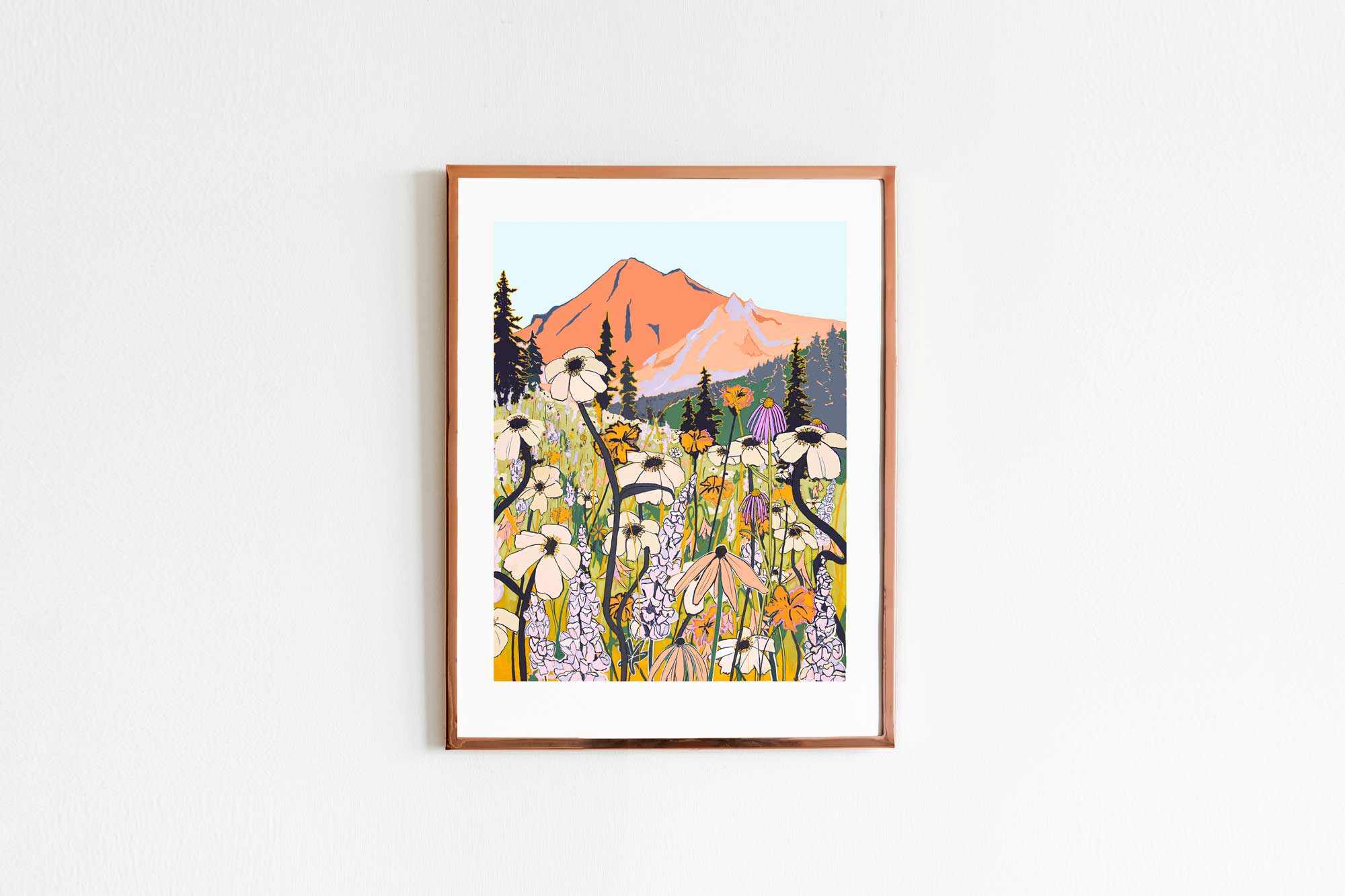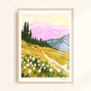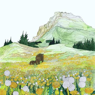 Banff is in the province of Alberta, located within Banff National Park. The peaks of Castle Mountain can be seen looming behind Elk, Grizzly Bears and Rainbow trout that swim in the turquoise glacier meltwater. Format: 12 x 16 inches High-quality digital wall art printed on textured felt FSC® paper from responsible sources. Shipped flat in 100% recycled cardboard in a compostable protective sleeve. Made with love in Canada.