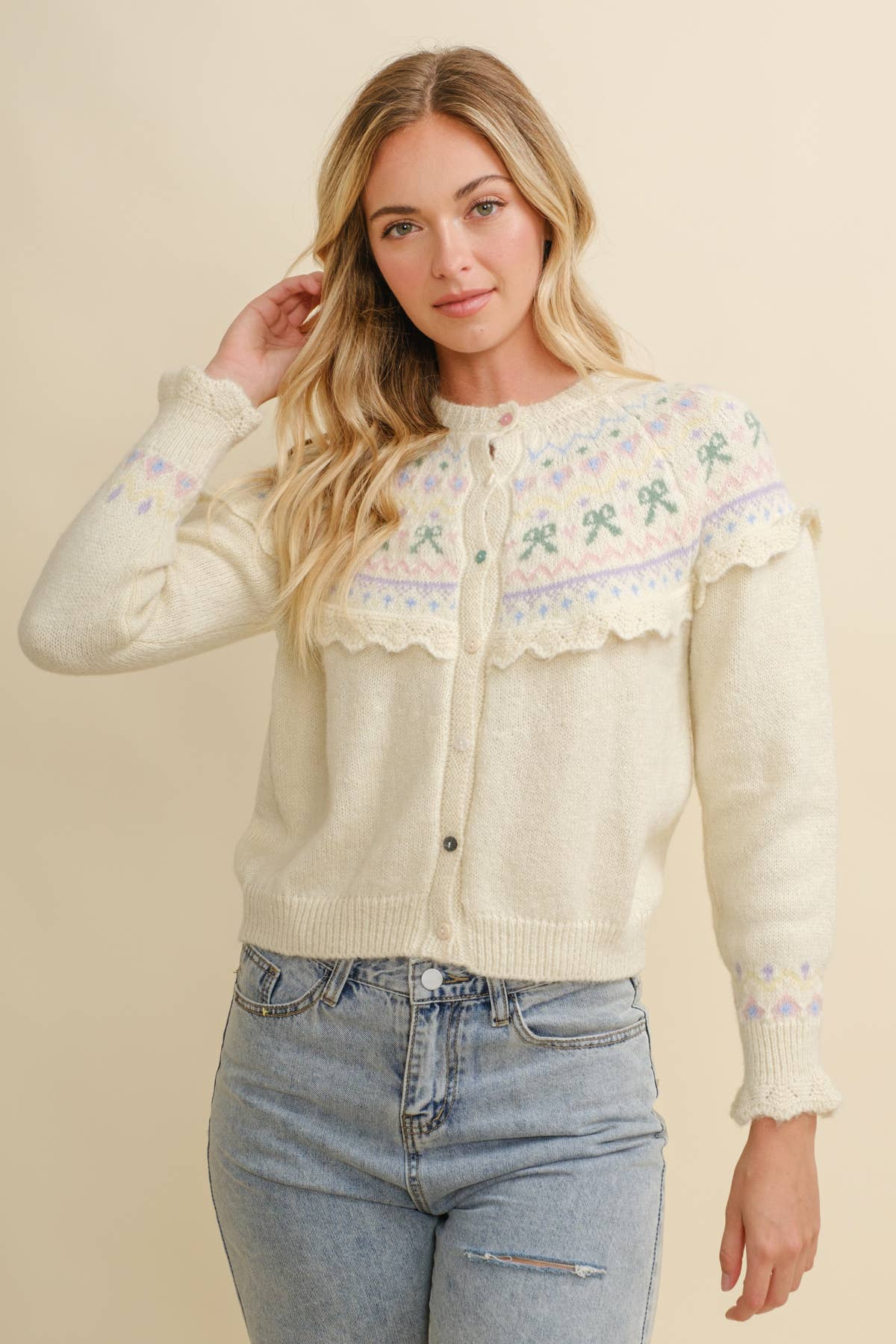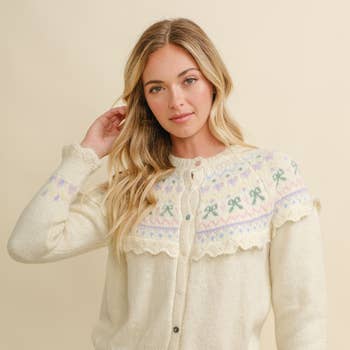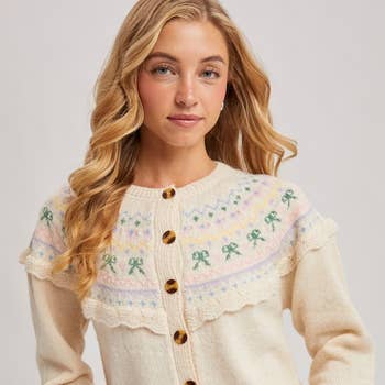 This is a charming button-front cardigan, crafted from a soft, creamy white and grey knit. Its standout feature is a traditional Fair Isle yoke, decorated with a whimsical pattern of bows and geometric designs in soft pastel shades of pink, lavender, yellow, and green. A delicate, scalloped knit ruffle frames the yoke, adding a sweet, vintage-inspired touch. The sweater is finished with contrasting brown tortoiseshell buttons, a classic crew neckline, and ribbed cuffs that echo the colorful Fair Isle motif, creating a cohesive and beautifully detailed piece. -Model is 5'9" and wearing a Small