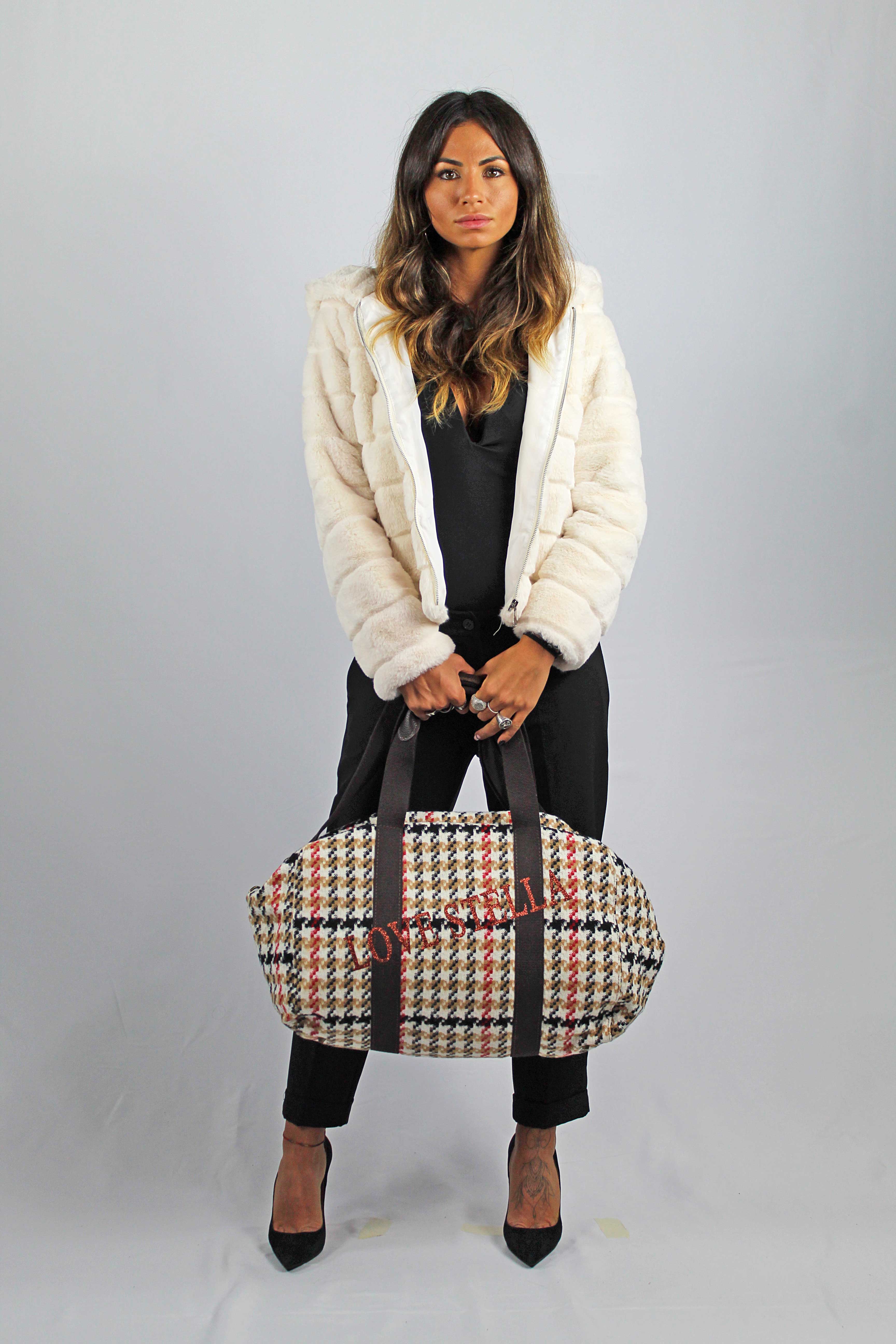 A perfect mix of boldness and sophistication, our duffel bag combines the energy of military style with the sparkling charm of reversible silver and khaki green sequins. Made with durable camouflage fabric and embellished with writable sequins, this maxi bag stands out for its unique design and impeccable craftsmanship. The interior, lined with high-quality satin, offers a touch of luxury and practicality, thanks to the internal pockets that allow for optimal organization. The iconic military-chic style reinterprets military clothing with glamorous details, transforming it into a sophisticated trend perfect for urban life. The camouflage pattern is not just a fashion, but a statement of character and personality. Soft, lightweight, and spacious, this bag is designed to accompany you on every occasion. Dimensions: Measurements LHW cm: 60x25x40