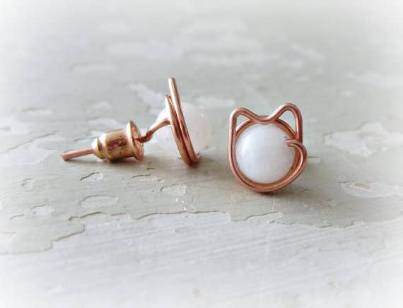 Hand formed and wire wrapped copper black cat stud earrings with natural Onyx stones. 6mm smooth and round black Onyx are securely hand wire wrapped with copper wire. A copper ear clutch finishes the earrings. I have stud earrings in a variety of stones and pearls in sterling, gold filled (not plated) and copper.