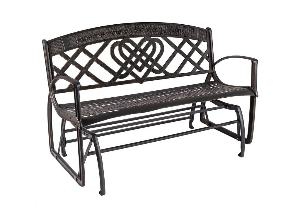 Our Cast Iron Celtic Bench and matching Glider Bench are sure to plant some Irish roots at your home, wherever it may be! Featuring a Celtic heart, this design represents eternal love and a union of souls. The words, "Home is where your story begins," grace the top of the design, making this a perfect housewarming or wedding gift as well! A bronze powder-coat finish and hand-painted highlights ensure long lasting maintenance-free beauty. Specifications (fully assembled): 50 1/4" wide, 36" tall and 27" deep. Seat height 16". Product Weight: 105 lbs. Seat capacity: 800 lbs. (2 persons)