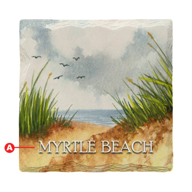 Single Absorbent Stone Tumbled Tile Coaster. Give us the City and State and we will place on this Coaster. All other text will remain the same. Made in the USA of absorbent stone to absorb excess condensation from beverages. Cork backing protects your surfaces from scratches and stains. Coaster measures 4 inch by 4 inch allowing for a larger glass or cup to be placed on them. This Single Coaster fits perfectly in a plant or basket to be given to friends and family. Give as a hostess gift or keep for yourself. Look for coordinating CounterArt Single Tile Coasters to complete your own set. Open Stock-No retail packaging.
