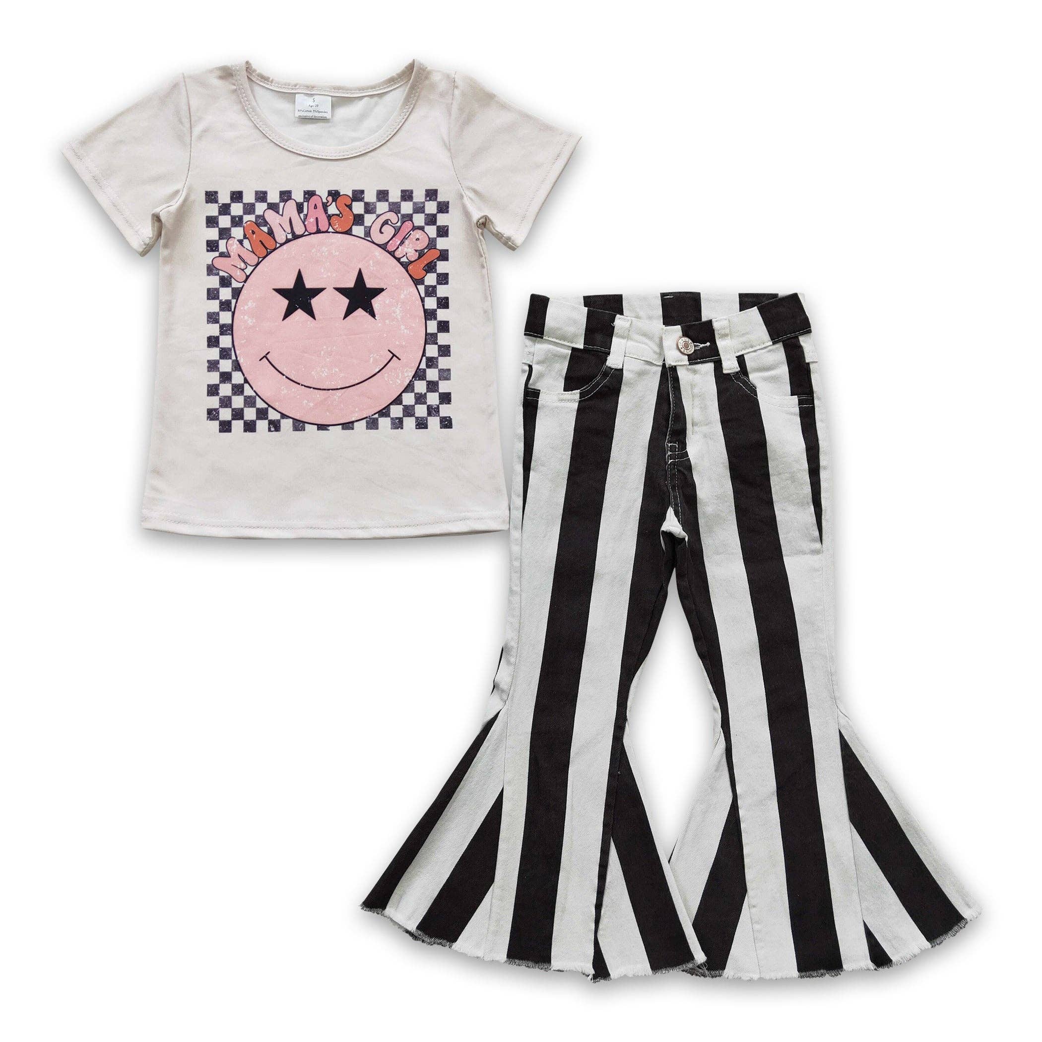 * Red long ruffled sleeve top with glittery "Be Mine" heart design and black tiered bell-bottom jeans design * We're OBSESSED with this unique and trendy belle bottom jeans set. This charming outfit with a glittery font "Be Mine" design and tiered hem denim will be the one your little love reaches for on Valentine's Day! * Jeans have an adjustable inner waistband for the perfect fit every time * Buttery-soft fabric with no bunching, itching, and stuffiness * Perfect for casual Valentine's Day classroom parties, pictures, and family outings * Set available in sizes for toddlers and girls