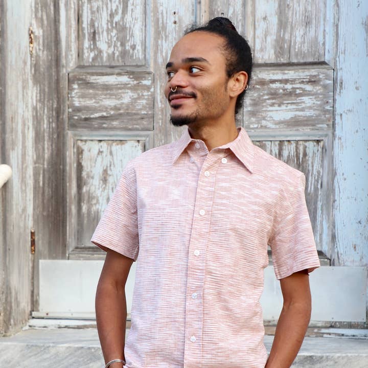 A short sleeve men's button-down shirt in a light blue woven cotton for summer or spring. Gentle tapering at the waist with a straight and narrow profile and a broader fit in the shoulders. 100% soft breathable cotton. Handwoven ikat fabric. Machine washable. Makes a great sustainable gift or Father's Day gift. FIT * Model is 6' and wears L * Slim fit, if you're in between sizes, we recommend sizing up * This fabric does not have stretch * Plus size clothing available FABRIC & SUSTAINABILITY * 100% woven cotton * Handwoven and hand dyed * Fair trade * Our clothing is handmade so there may be a 5-10% shade variation between the product pictures and what you receive WHERE IT'S MADE * Designed in New Orleans * Handmade in India