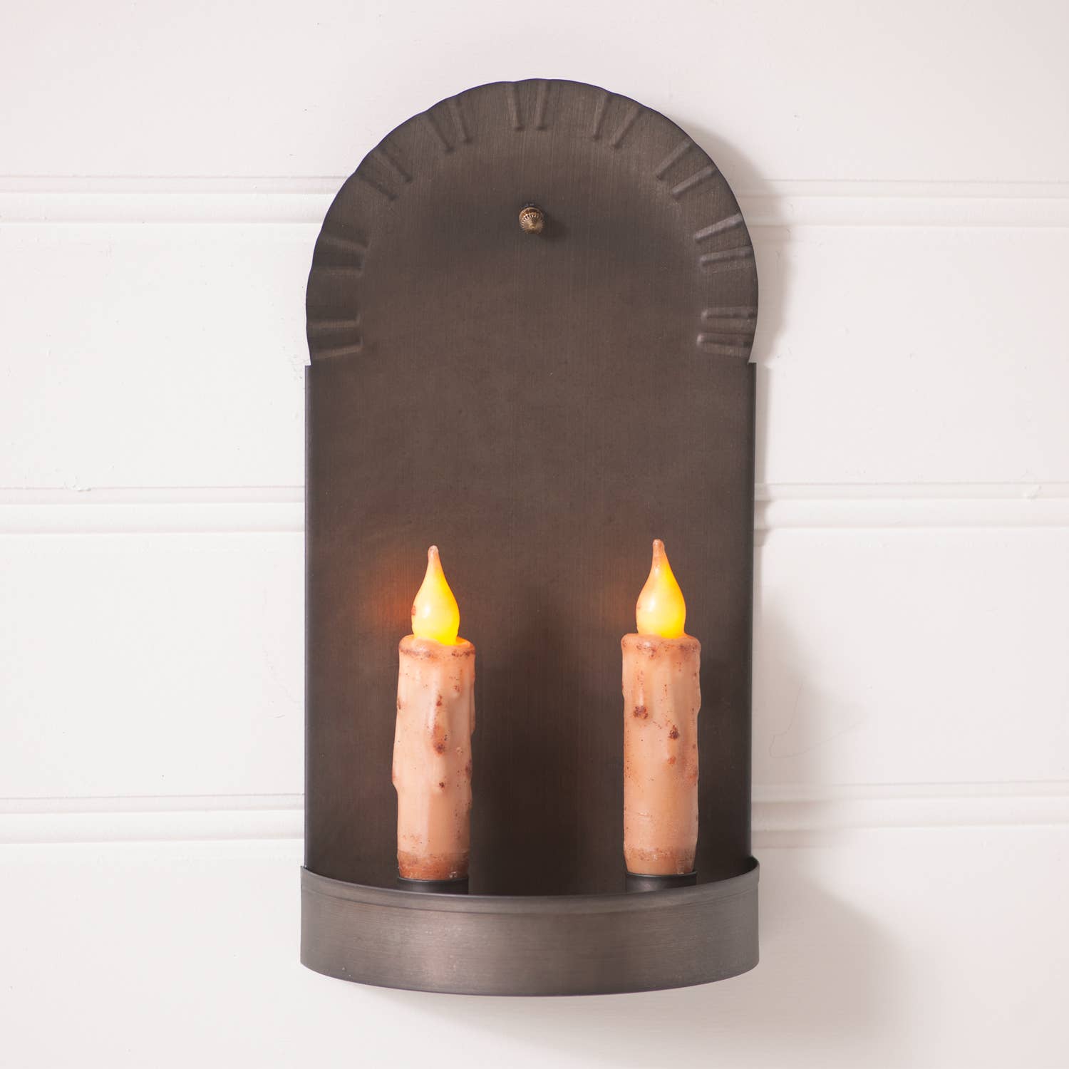 One of our very first products, this heavy-duty wall sconce is crafted from solid metal and built to last. Its simple, functional design includes pre-drilled holes for easy installation. Metal 14 inches high x 1 inches wide Crafted by our Amish blacksmiths who live and work off the grid, each piece in our collection reflects generations of skill and tradition. Like all our products, The Twin Candle Sconce is proudly made in the USA. Made in small batches by hand, some variation may occur.
