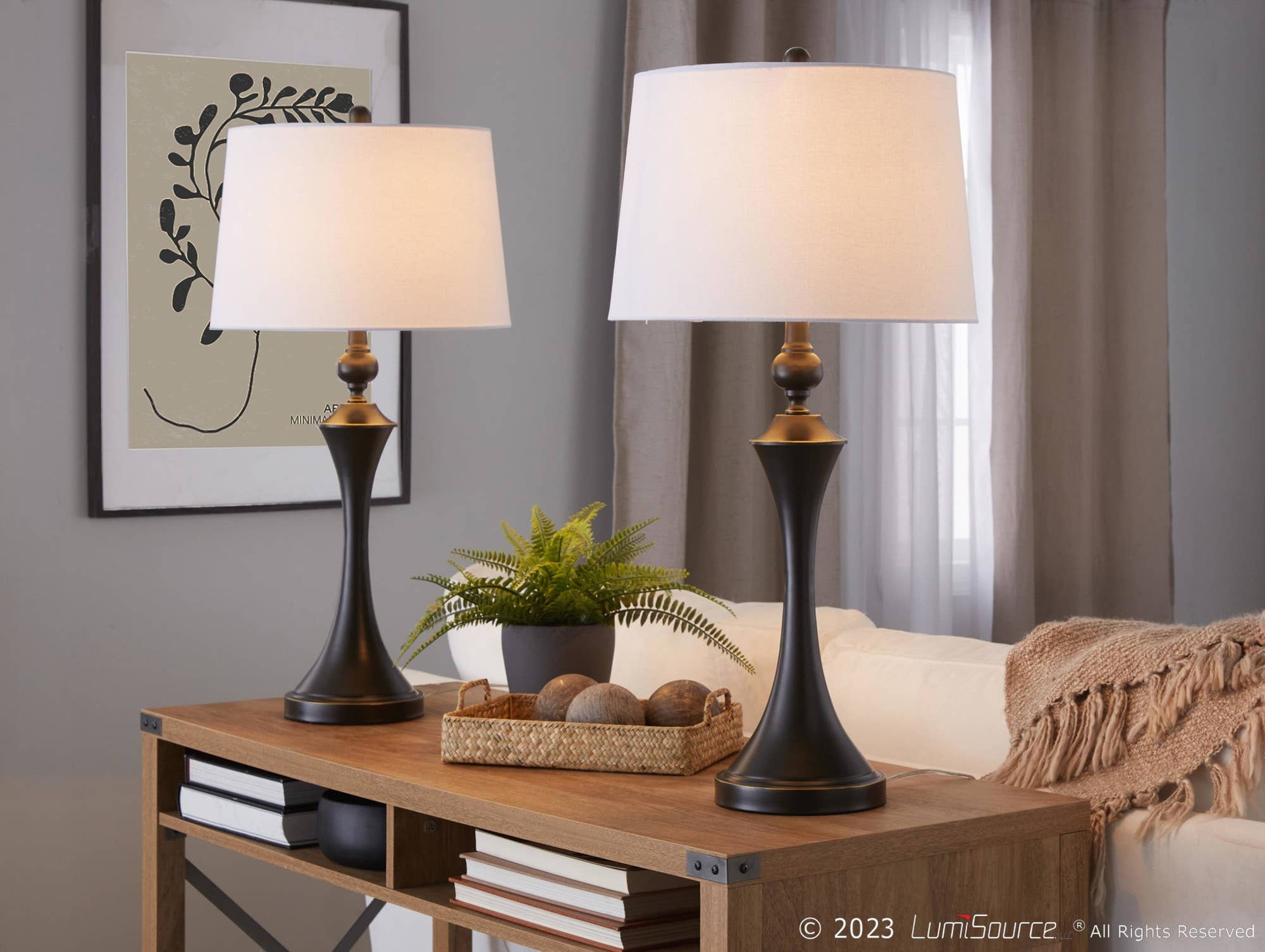 This beautiful set of polyresin table lamps features an attractive farmhouse chic look, complementing modern and reclaimed design elements. The spindle-like bodies have a reclaimed grey finish, which is a grey-brown color. Paired perfectly with a natural woven linen lamp shade, these lamps' neutral coloring will compliment any room. This pair is perfect for bedside tables, dressers or any space that you are looking to add some classic yet modern farmhouse decor. Set of two lamps, each is 32" tall. Round bases are 6.5" wide. Hardback tapered drum shades are 16" at their widest and are 11.5" tall. Each lamp uses one 100-watt maximum "A" bulb (not included) and features an E26 socket with a 3-way switch.