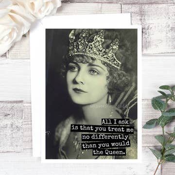 Let the queen of your heart know how much you care. This greeting card can work for an anniversary, Valentine's Day, or for everyday. • 4.25x5.5" (A2) folded greeting card • Printed on 110 lb smooth stock • Includes a white A2 square flap envelope • Blank inside • Available in two skin colors: light and dark • Packaged individually in a clear sleeve Front of card wording: "To the queen of my heart"