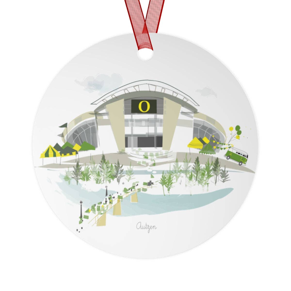 Metal Christmas tree ornaments are durable and will bring holiday cheer for years to come. Their surface is scratch and chip-resistant, so they can be stored together in the famous Christmas decoration box. White aluminum base with a glossy finish Scratch and chip resistant surface Each ornament comes with a red ribbon for hanging