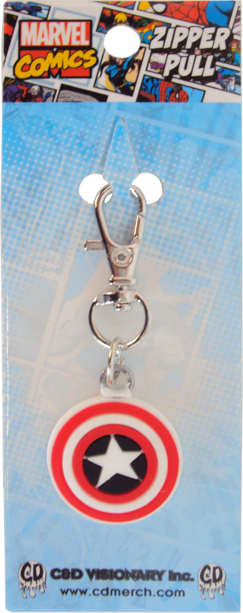 The zipper pull measures 1.25" x 1" not including clasp or rings and comes on a colorful retail ready card that measures 4.75" x 1.75"