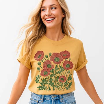 Made in United States Aesthetic: Bohemian and Retro / vintage Care Instructions: Machine wash Fit: Plus Size and Unisex Neckline: Crew neck Occasion Theme: Everyday, Fourth of July, and Memorial Day Occasion: Everyday and Holiday Pattern: Floral Season: Spring/Summer Sleeve Length: Short Sleeve Product Language: English Fabric: 100% cotton Weight: 226.8 g (8 oz)