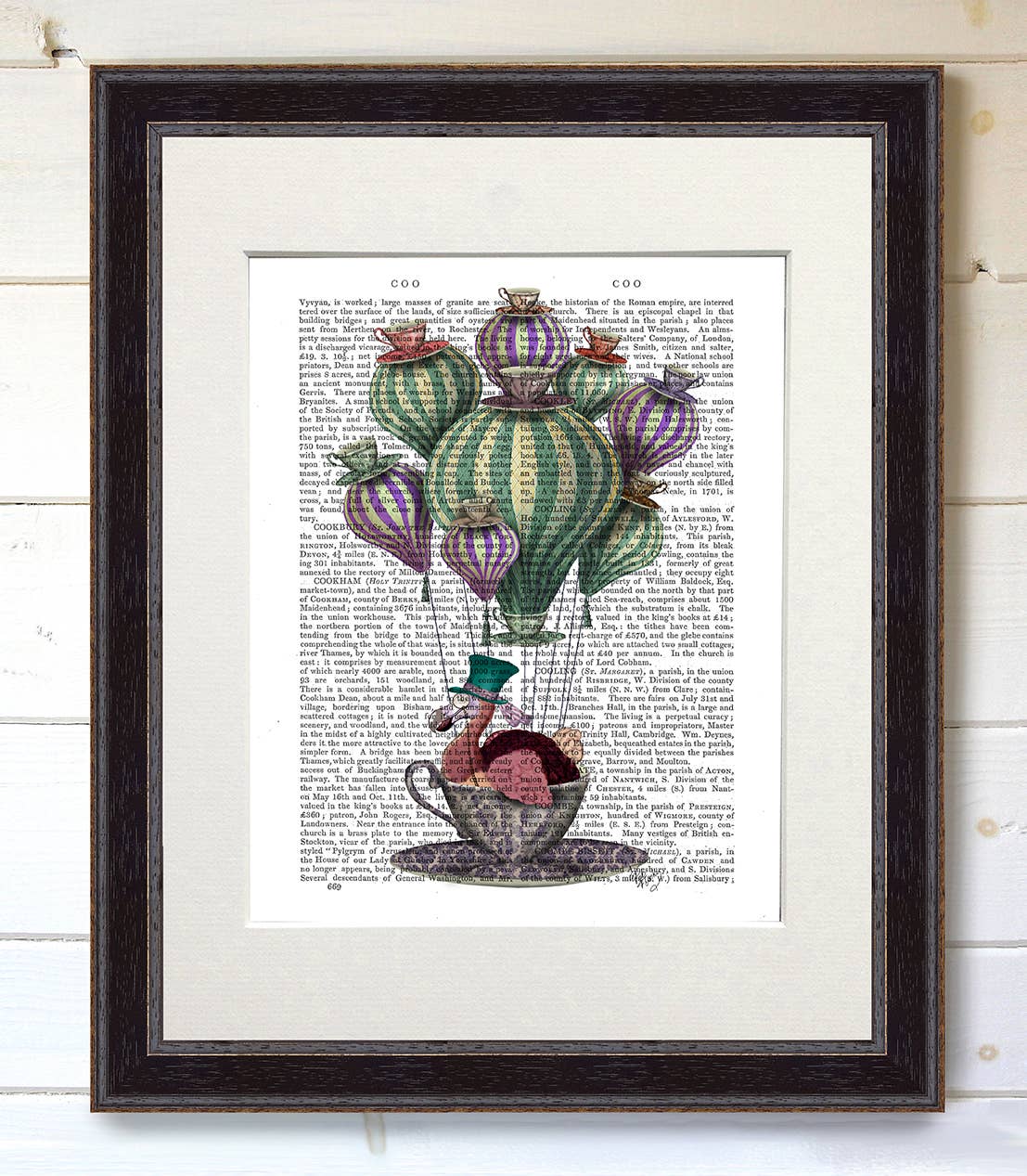 Imaginative illustrations from Kelly Stevens-McLaughlan printed onto the pages of antique books from the 1800s. Charming and unusual artworks that have vintage character and timeless style. Options: 1 - Real antique book page, in a 11x14in white mat. 2 - Real antique book page, in a 11x14in white mat, and FRAMED in black, white or caramel wood. Beautiful and ready to hang.