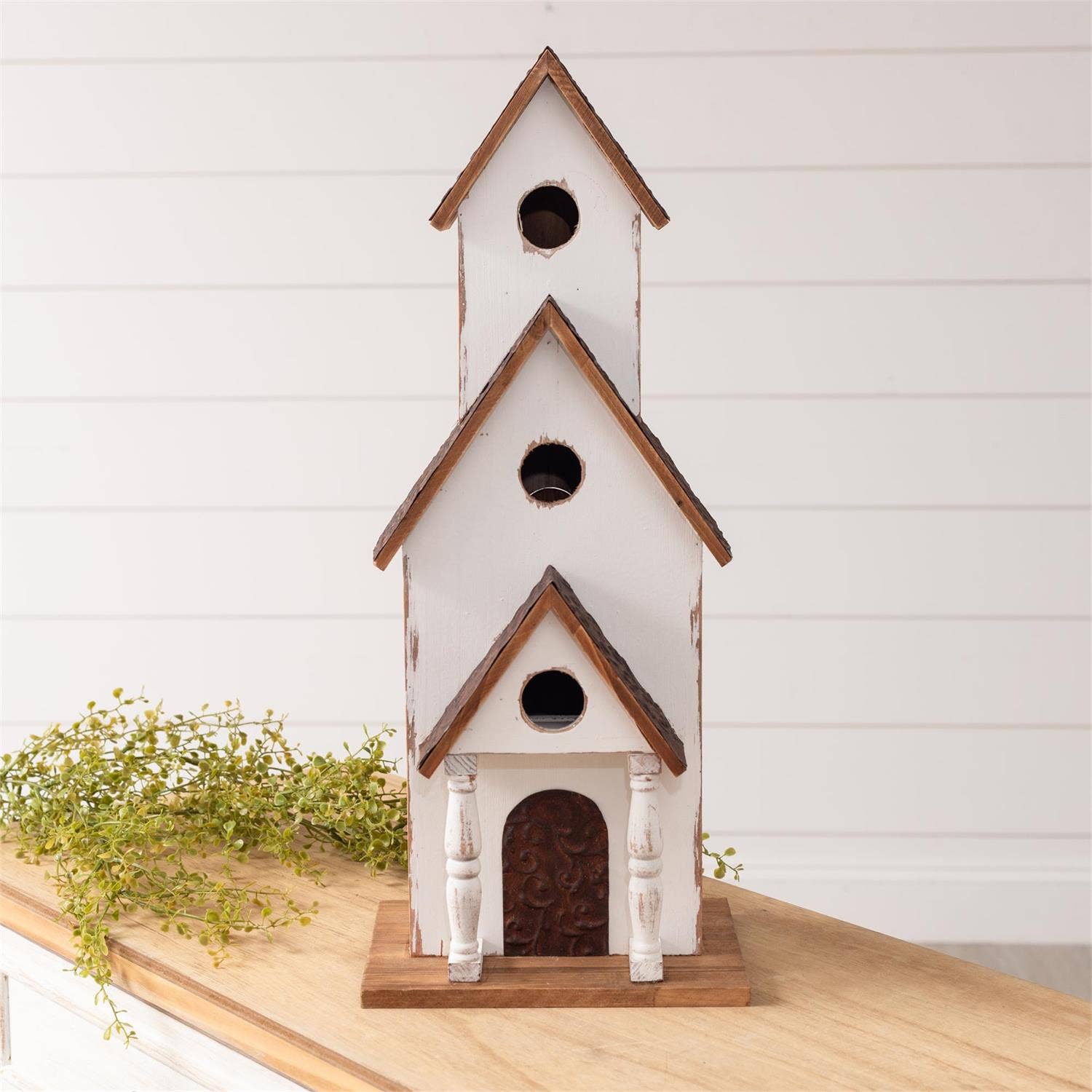 Elevate your garden with our 73.75" tall four home bungalow copper birdhouse stake. This birdhouse features creative architecture with multiple rooms and entrances, perfect for attracting various bird species. Crafted from powder-coated iron, it boasts a weather and rust-resistant design with a distressed antique copper finish. Features: - Weather & rust resistant - Crafted from powder-coated iron - Sturdy three-prong stake - Distressed antique copper finish - Includes drainage and ventilation holes - Partial assembly required (no tools needed) Birdhouse Specifications: - Height of birdhouse only (no stake): 18.1" - Number of perches: 4 - Number of entry holes: 4 - Entry hole diameter: 1.75" - Inner birdhouse height: 14.2" - Inner birdhouse length: 9.8" - Inner birdhouse width: 5.7" - Height of stake only (no birdhouse): 55.65" - Number of stake prongs: 4 - Dimensions: 13.25" L x 7" W x 73.75" H