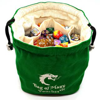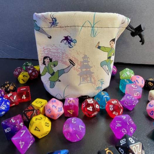 This handmade dice bag is great for carrying around your dice and other gaming accessories. It is made of decorative cotton fabric, black liner fabric, and has a drawstring closure. It can hold about 100 dice. It's a great addition to any table top gaming collection! This dice bag is packaged in a clear plastic hanging bag with a business card.