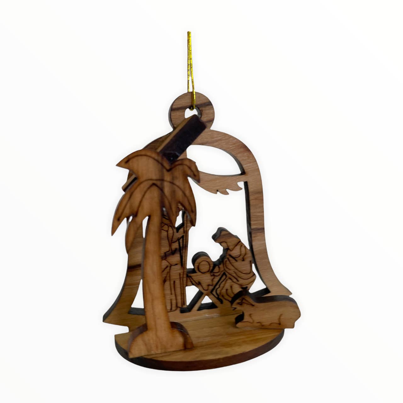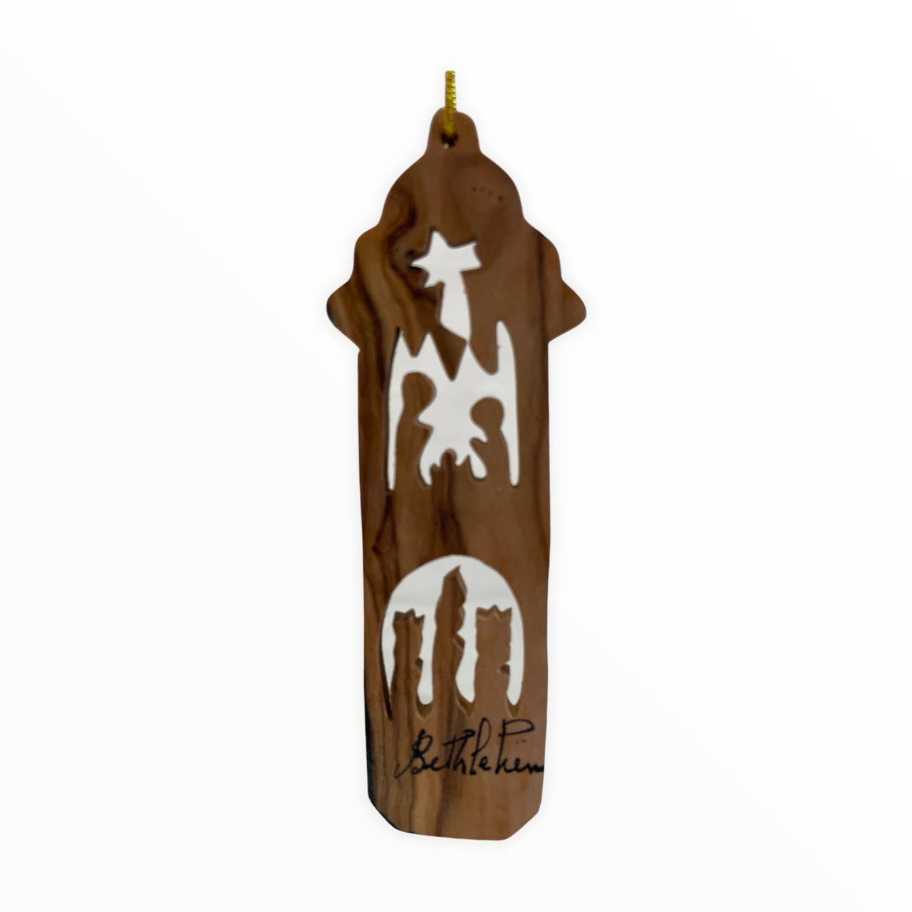 Olive Wood Small Comfort Cross with Dove Ornament Dove is Carved all the way through the wood. Add a special touch to your holiday season this year with olive wood ornaments. This unique design was exclusively hand carved in Bethlehem, the holy land using a scroll saw. Ready to hang. Comes with a golden string and an explanation card. Dimensions width: 1 1/2" Dimensions height: 2 3/8