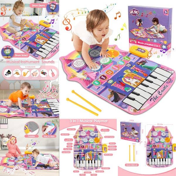 Play22 Colorful Keyboard Playmat is perfect for toddlers, kids, and even adults. Comes with 24 touch-sensitive keys and 8 musical instruments. You can play Piano, saxophone, violin, clarinet, trumpet, banjo, xylophone, and guitar. Featuring 4 demos and adjustable volume with a non-slip design. Whether you want to record or playback, you can do it with this playmat. Folds up for easy storage and it is made of heavy-duty material.
