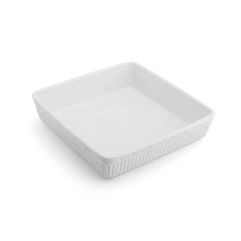 Cook and serve in style with this Everyday White Bistro Casserole Dish by Fitz and Floyd. Made of durable porcelain with the words "Market Fresh" embossed on one side, this charming dish is ideal for making casseroles, lasagna, ziti, and other baked favorites, and features sturdy handles so you can bring the hot meal directly to the table using oven mitts. Measures 13-1/4 inches long by 8-1/2 inches wide by 3-inches high with a 3-quart capacity. Dishwasher and microwave safe, and oven safe up to 450 degrees.