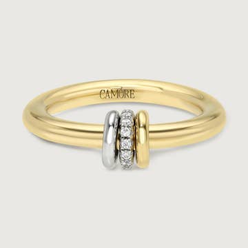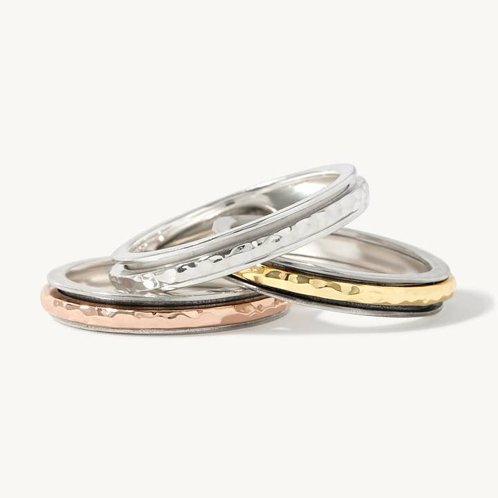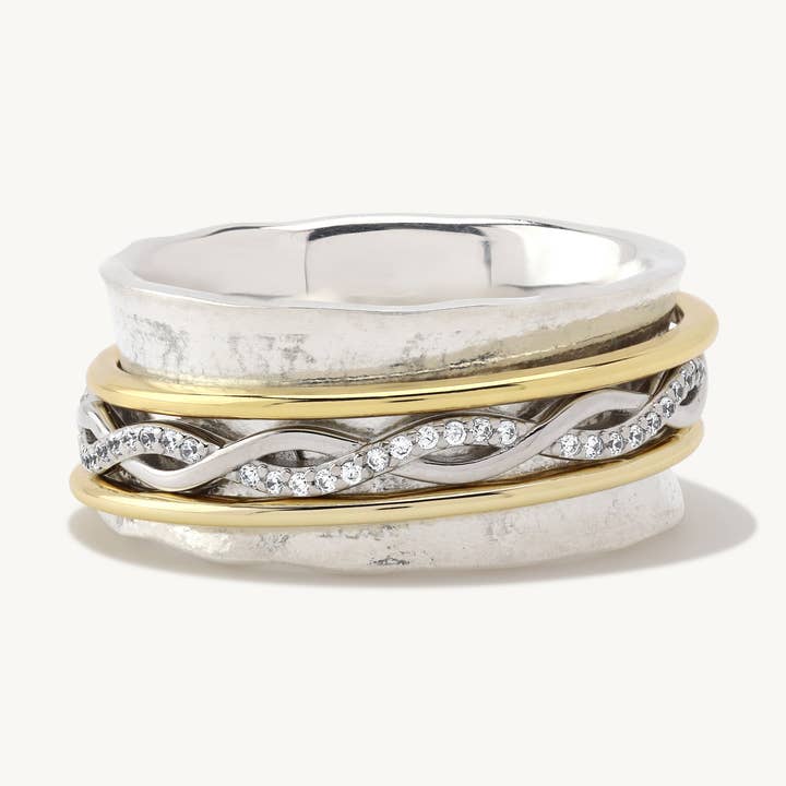 Enjoy lots of movement with this sterling silver spinner ring. The slight lip encases two slender hammered 14K yellow gold rings embracing an inner ring crowned with sparking 5A Grade CZ's all spinning freely. Known to help lower stressful feelings while also looking fabulous. Crafted so that each band moves independently of the others yet stays positioned to create an eye-catching ring that completes any outfit. Please Note: Due to the one-of-a-kind nature of this ring, exact colors and patterns may vary slightly from the images shown. Comes with a 925 sterling silver quality stamp as a symbol of guaranteed product quality. Free Gifts Included: * Premium Ideaure Jewelry Polishing Clothâ„¢ * Luxury Gift Packaging Ring Specifications: * Ring Width: 10.2mm * Ring Weight: 7.1g * Materials: 925 Sterling Silver, 14K Yellow Gold Filled or 14K Rose Gold Filled * Band Colors: Sterling Silver, Yellow Gold, Rose Gold * Gemstone: Conflict Free Simulated Diamonds