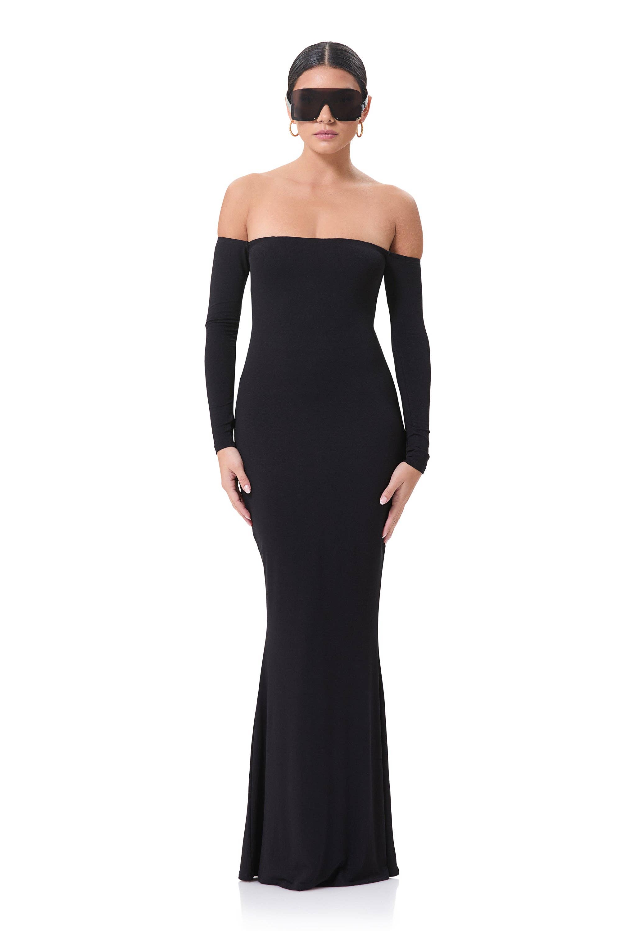 OFF-SHOULDER LONG SLEEVE RUCHED FIT-IN MAXI DRESS