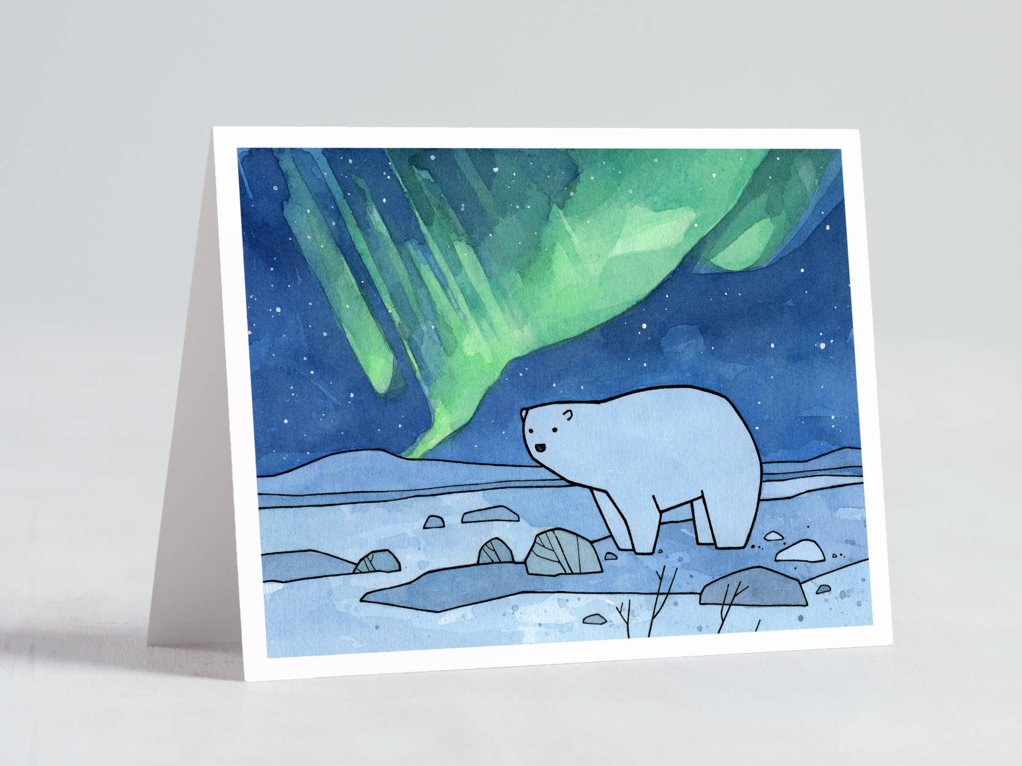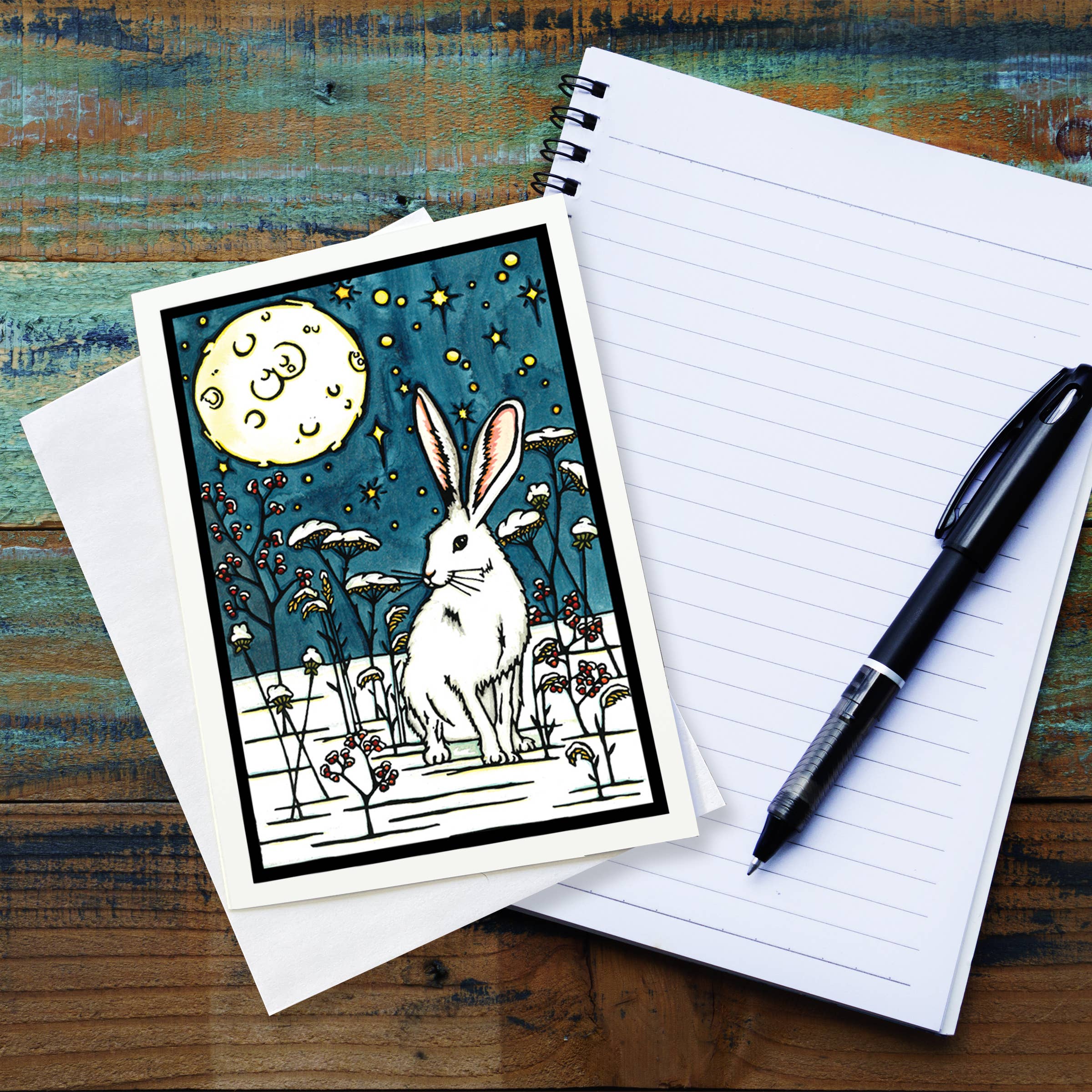 A card featuring a white Snowshoe Hare under the Northern Lights. Illustrated with ink and watercolors. A fun and unique card for the holidays! - 5x7" standard size Greeting Card - Blank Inside - Envelope included - Protected in clear sleeve - High quality, sturdy card stock