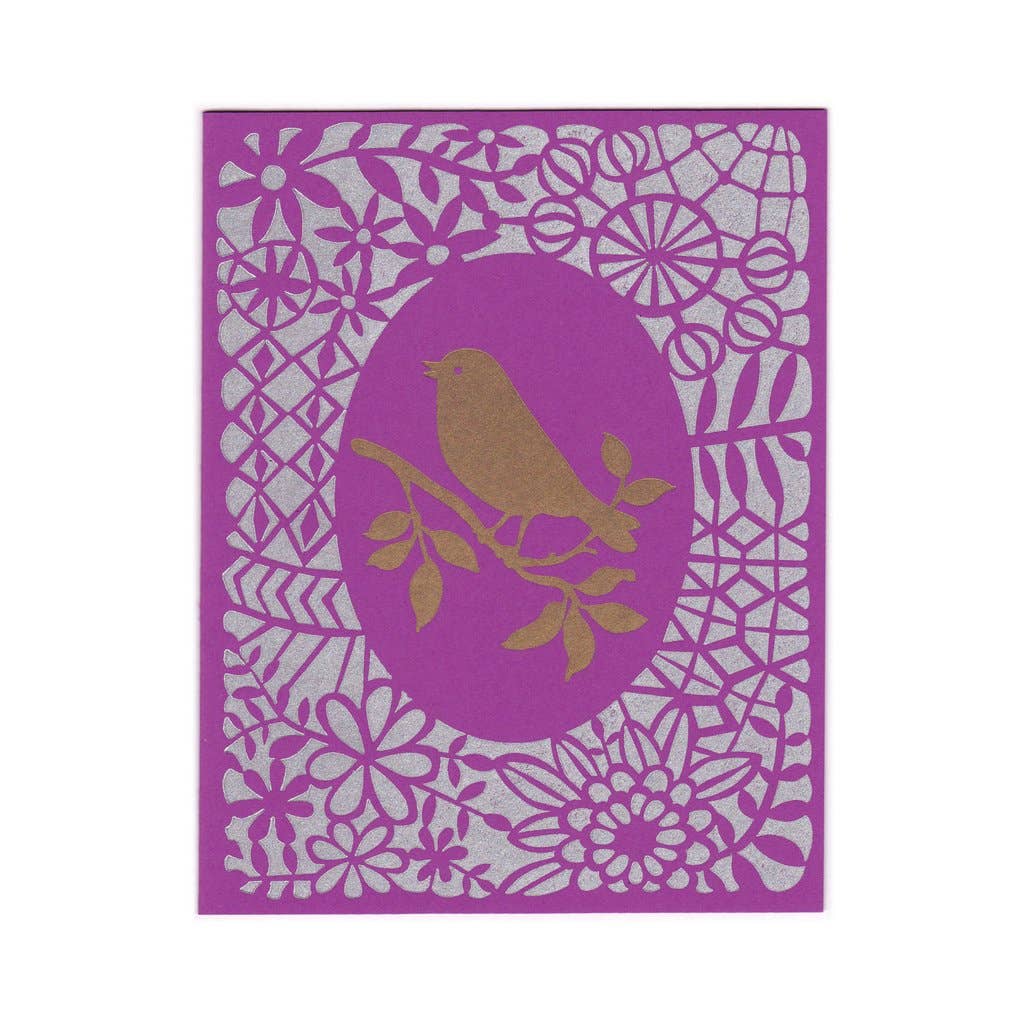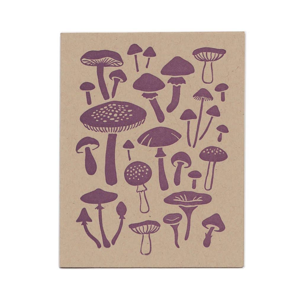 Blank greeting card features my original illustration, a collection of mushrooms based on the ones I see on my morning walks in the Maine woods. Printed in purple-gray ink on recycled brown paper, on an antique letterpress in Portland, Maine. Each card comes with a recycled brown envelope. Cards are blank inside. Cards are packaged for retail sale in a clear cello sleeve with a sticker on the back. Standard A2 size, 4.25" x 5.5".
