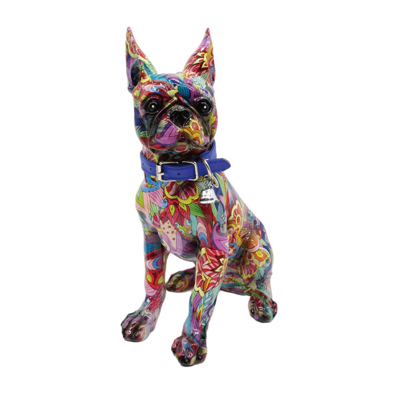 This dog sculpture features a bold, abstract interpretation of the breed, with vibrant blue paint dripping down its form, creating a striking visual contrast. This dynamic piece combines playful whimsy with urban street art influences, capturing the French Bulldog’s spirit through expressive color and fluid motion. Specifications: - Imported - Material: Resin - Color: Multi-Color - Weight: 1.25 lbs. - Dimensions (inches, LxWxH): 6.75 x 4.5 x 8 - Home Decor, Gifts, Dog Toys, Sculpture, Dog Mom