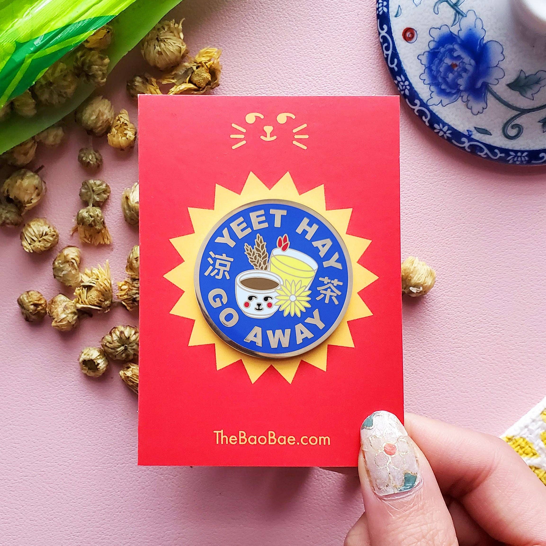 Yeet hay is that thing your Chinese mom warns you about, but you can never fully explain to your non-Chinese friends. You can't live with it, but definitely can't live without it. So after you "Yeet Hay All Day", be sure you get back in balance and make that "Yeet Hay Go Away"! Hard enamel pin 1.5" (3.81cm)