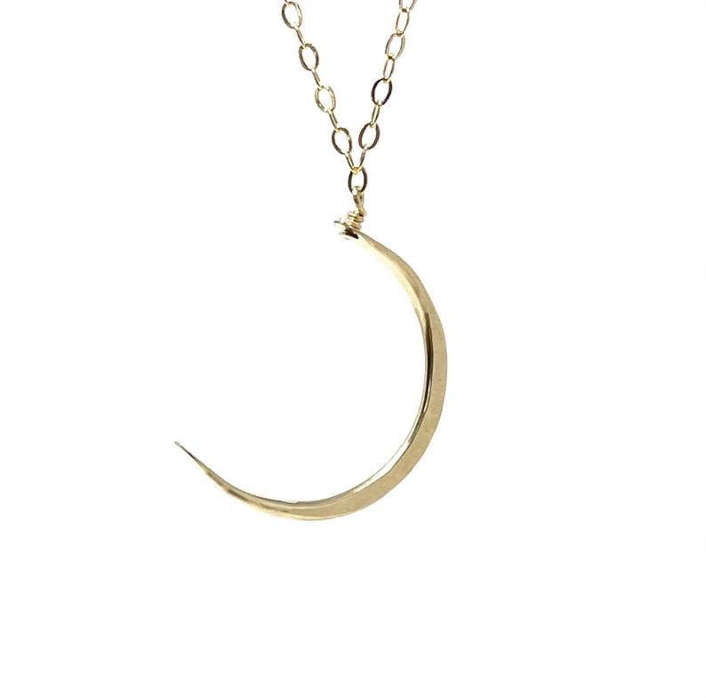 This stunning necklace looks great worn on its own or layered with other necklaces. The crescent shaped pendant is cut from 14kt gold filled or sterling silver sheet and hammered with a dappled texture to catch the light. It is suspended on either side from 14kt gold filled or sterling silver fine cable chain. The necklace length is 16 1/2” and is finished with a spring ring clasp and my signature large end ring.