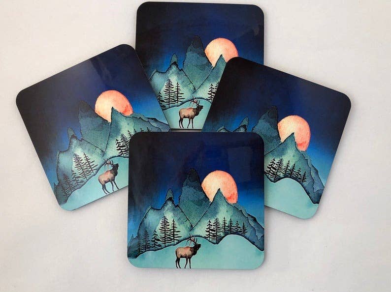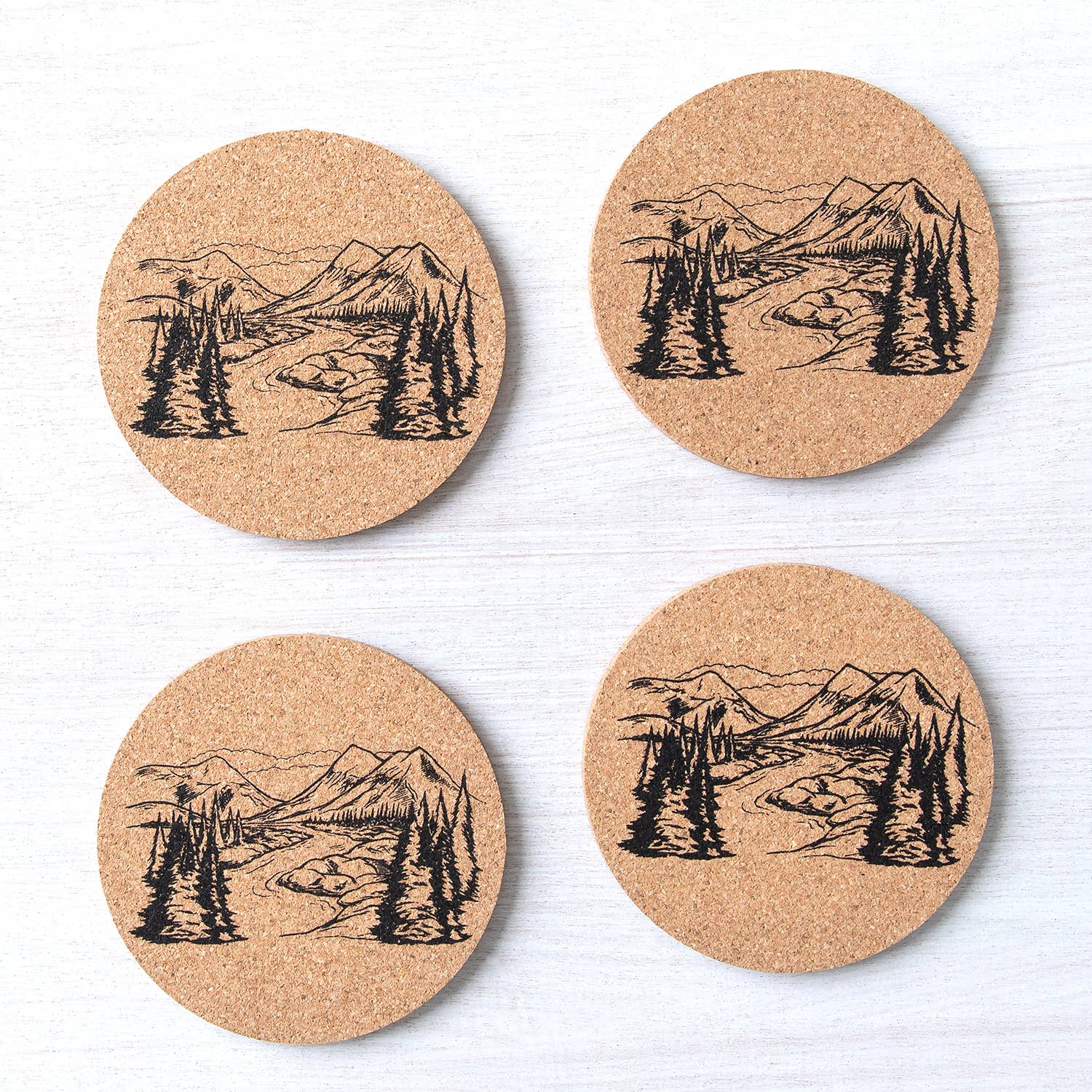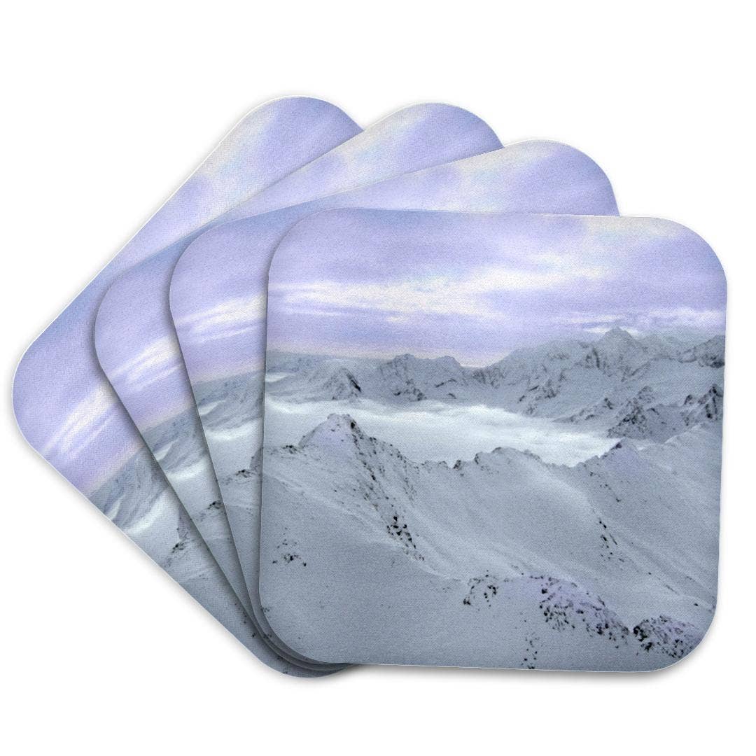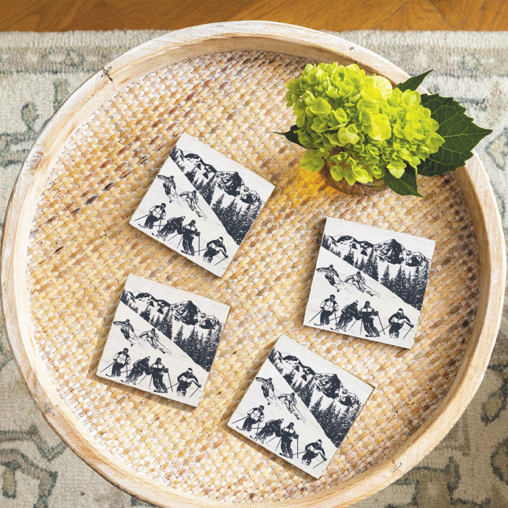 Winter Mountain snow 4 piece hardboard coaster set with cork backing and gloss finish, 3.75" x 3.75". Comes in brown kraft box with window. This item can be name dropped with your town, state or resort