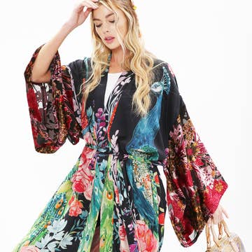 Bring luxury into your everyday with this Delicate Tropical Kimono Jacket, sure to have you channelling your inner Hollywood starlet! Jungle greenery and fabulous florals transport you into a Powderful world full of unforgettable and high-end design. This can be worn so many ways - combine with a jumpsuit or with your favourite jeans and top combo for effortlessly chic styling. The perfect gift for a loved one or for Mother's Day! One Size. 50% Viscose / 50% Modal. Cool hand wash.