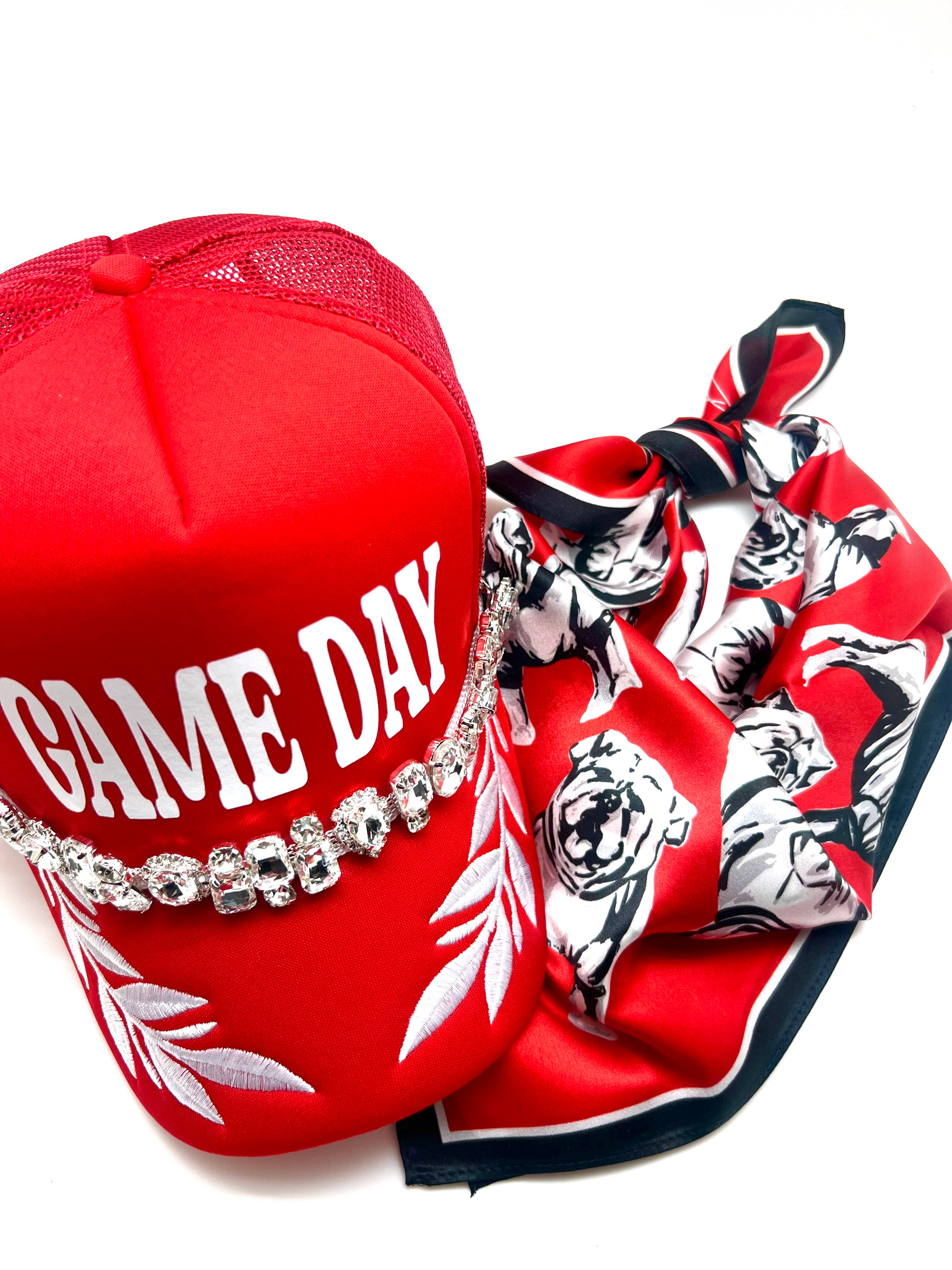 Cheer on the Georgia Bulldogs in style with the Sic ‘Em gameday scarf- the must have accessory for any true Dawgs fan! Whether you’re tailgating outside Sanford Stadium or watching from home, this silk scarf is the perfect accessory to show off your red and black pride! Size: 22"x22". Perfect for hair, purse, or neck ties. Material: 100% Silk