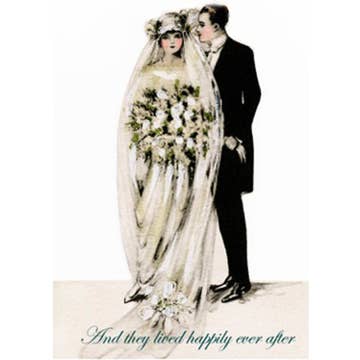 At the turn of the century, brides often wore simple dresses and lace veils, which are represented in this wedding card. The lavender sepia tones create a subtle romantic feel as the young bride carries an arm full of wildflowers. Sparkling glitter is added by hand to accent the bride. Wish someone "Congratulations" on their nuptials with this 5" x 7" greeting card.
