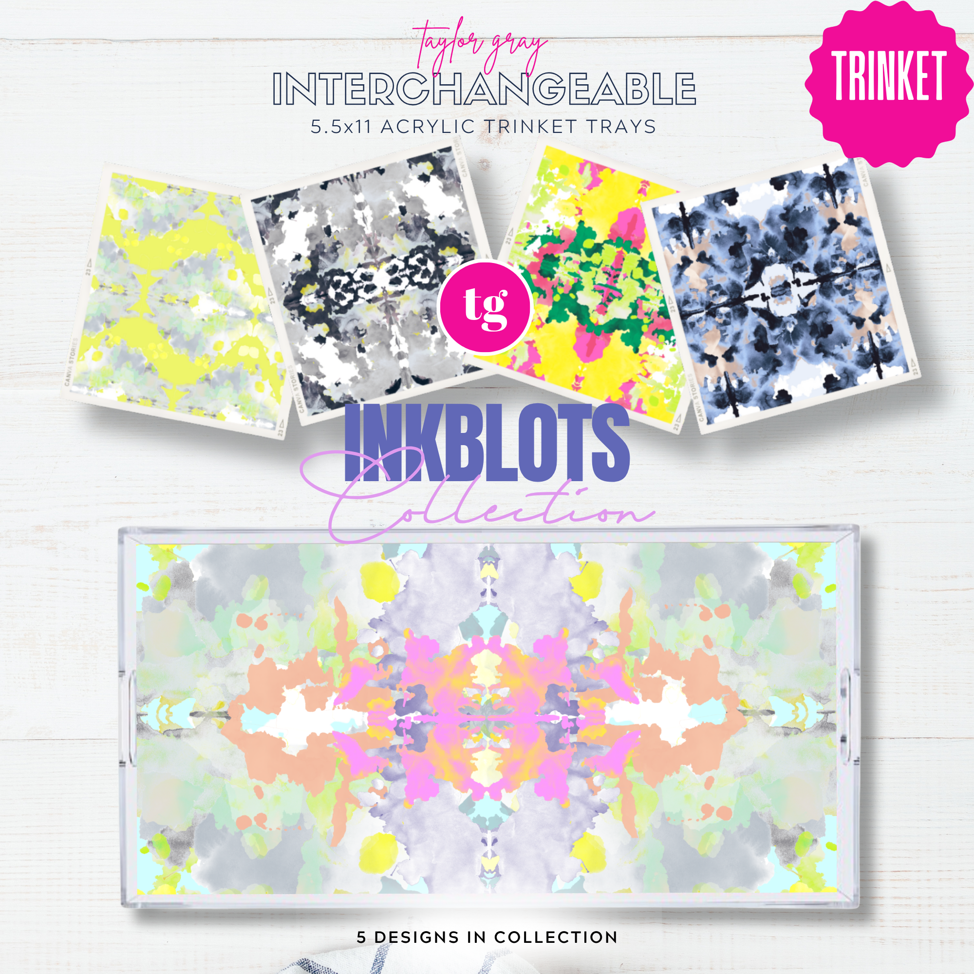 ***PRE-ORDER for OCTOBER 20th*** This listing is for a blank trinket tray with the protective pocket to slide in your insert sets. **The TAYLOR GRAY acrylic TRINKET TRAY is a 11x5.5 tray that perfectly fit our TRINKET insert designs. The patent pending pocket on the bottom of the tray allows the inserts to be easily interchanged and protected. Acrylic trays are all the rage and are definitely on trend. Why should you settle for one design when you can have FIVE designs and change them out on a whim?