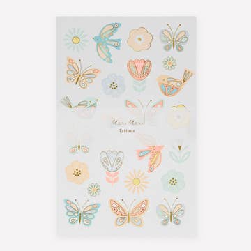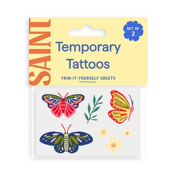 Step into a world of wonder with our 'Secret Garden' tattoos! This enchanting collection of temporary tattoos features 3 delicately hand-painted butterflies, 3 petite flowers, and sprigs of lush greenery. Perfect for kids who love to imagine magical gardens and adults who adore a touch of whimsy. DETAILS: Set of two temporary tattoo sheets Dimensions: 2" x 3" Safe, non-toxic, and FDA compliant Printed in the USA Application Directions: Place the tattoo face down on skin. Apply even pressure to the tattoo paper backing using a wet cloth. Wait a minimum of 60 seconds and then remove the cloth and gently slide off the paper. Full Application directions are included in your package.