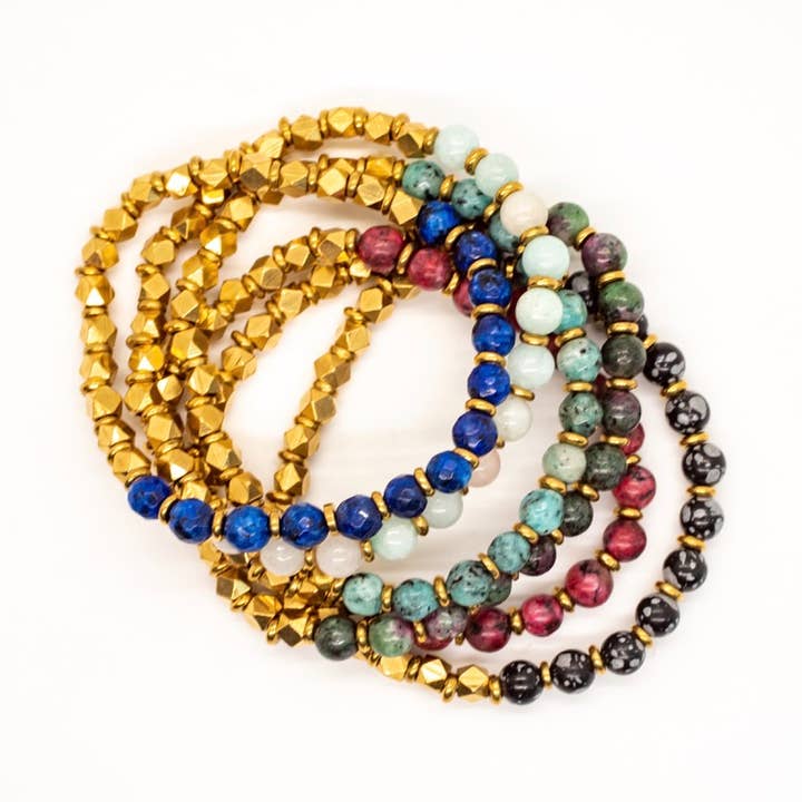 SKU: BBB049-AZ Made in India Material: Brass Stone Type: Amazonite, Amethyst, Jasper, and Turquoise Weight: 25.51 g (0.9 oz) Dimensions: 17.8 cm (7 in) Packaging: Recyclable Production: Ethically sourced and Fair trade