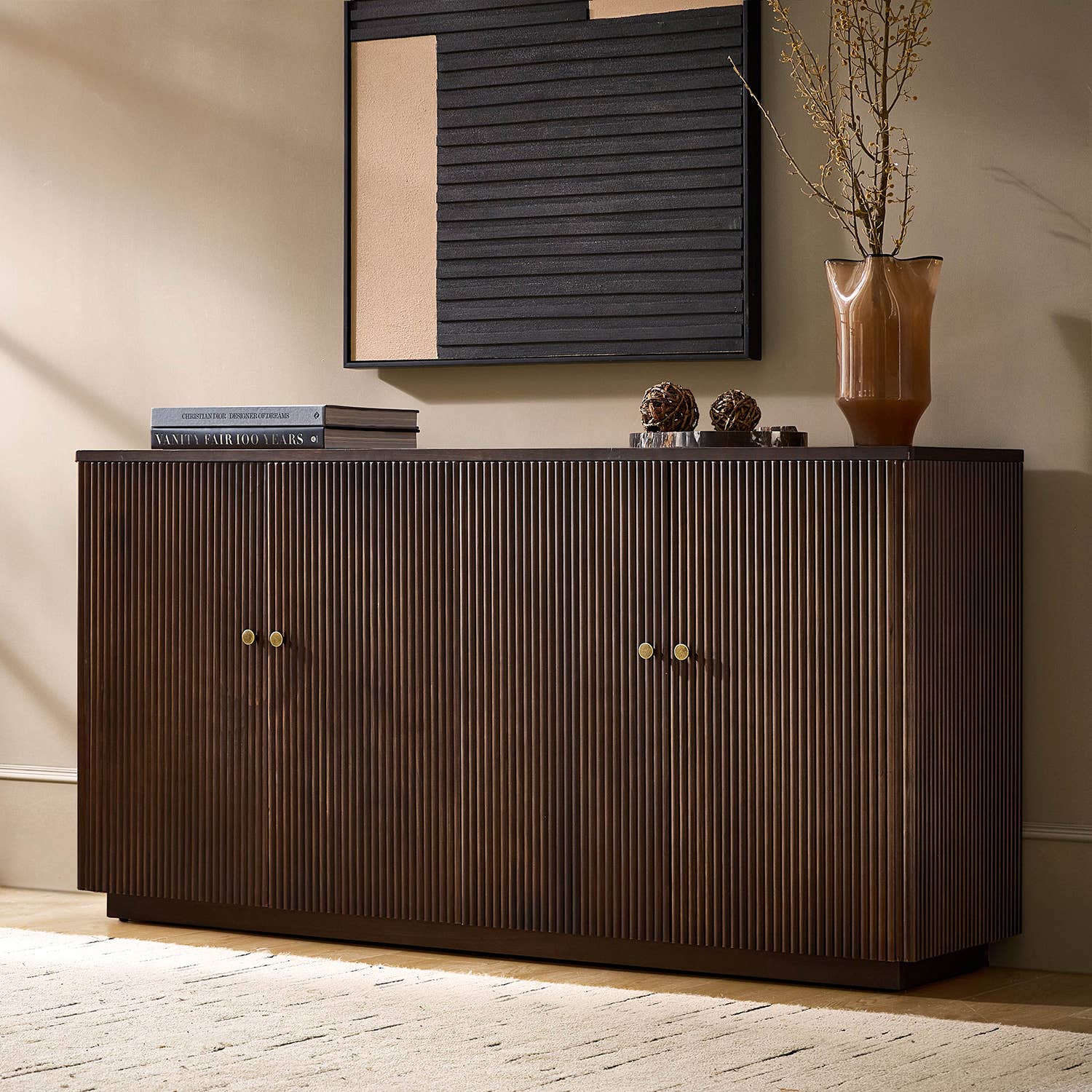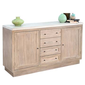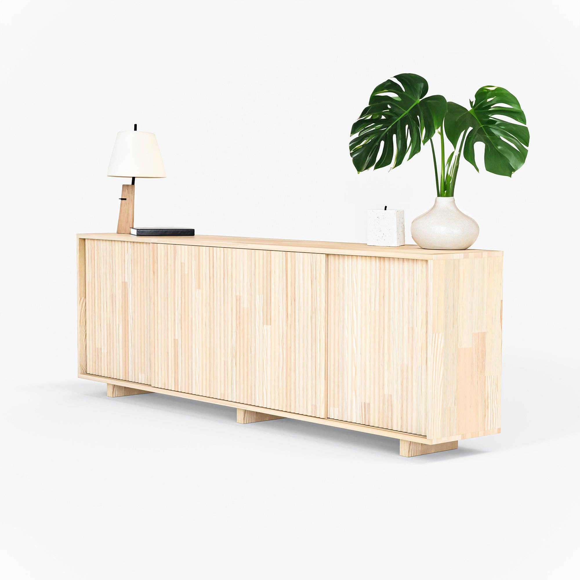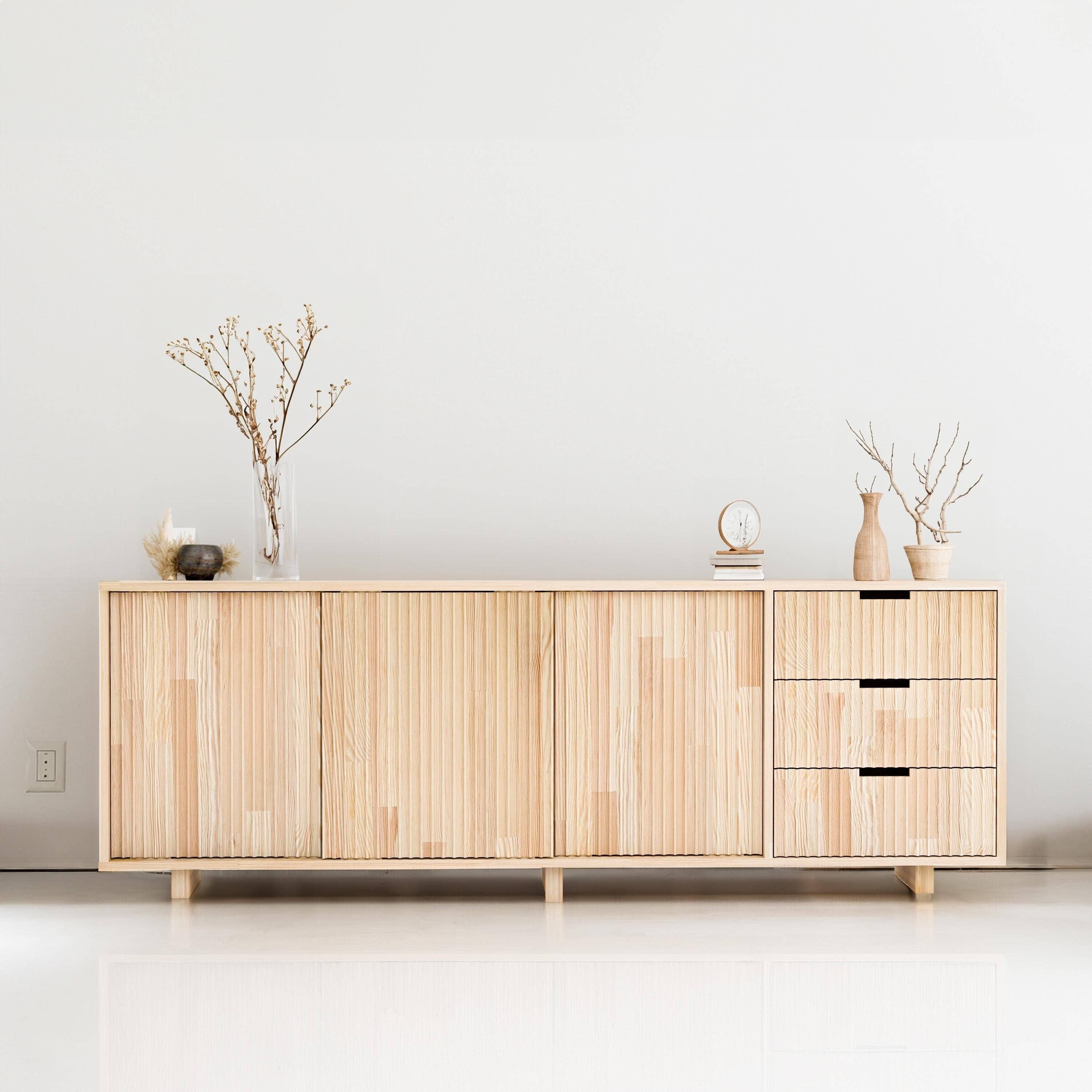 Expertly crafted from FSCĀ®-certified pine wood, this versatile piece blends style and functionality. Featuring handmade drawers and spacious storage behind sliding doors, itās perfect for organizing anything from tableware to electronics, books, or decor. With its minimalist Scandinavian design and textured finish, this buffet doubles as a media console, sideboard, or modern credenza, fitting seamlessly into dining rooms, living spaces, or entryways. Durable, eco-friendly, and timeless, it elevates any interior.