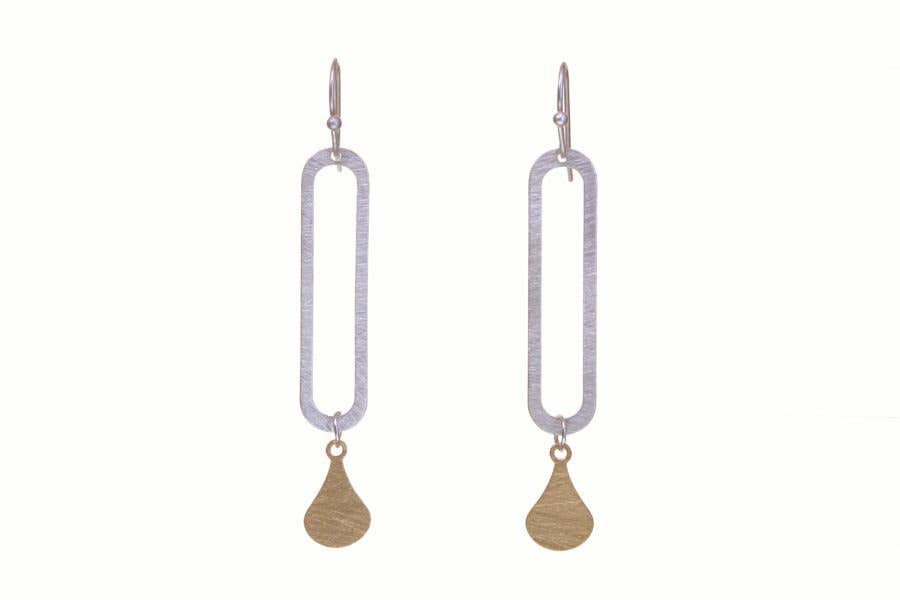 Two medium layered rounded rectangles with light hammered texture. Wire earring. A fun and modern wire earring with architectural shapes. Dimensions: 0.33 inches wide by 1.2 inches tall (not including the wire) Backing Option: Wire Only Metal Color: Brass and Silver Style #E1366DW