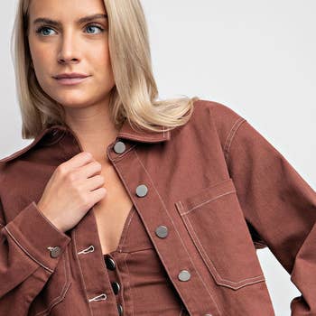 FAUX SUEDE JACKET WITH POCKET DETAILS SELF:90%POLYESTER 10%SPANDEX, LINING:100%POLYESTER | IMPORTED MODEL IS 5'8" AND IS WEARING A SMALL