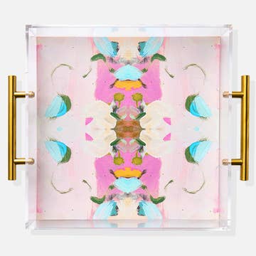 WHY OBSESSION?!! Because these trays are so good that people are literally obsessed! We sell them out quicker than we can keep them around! All trays are one of a kind original works of art. They have great depth and dimension and are an amazing gift for those extra special occasions... and/or extra special people! They're great to gift yourself, too! Just the thing your coffee table (or dresser... or kitchen island... or...) has been craving! Note that images shown are a guideline and not the exact tray you will receive. Each tray is handmade and one-of-a-kind, which means they will vary from tray to tray. Large main elements and overall color scheme will remain the same, but the small pieces are subject to change. Acrylic tray with brass handles and rubber feet 18.5" x 11.5" x 1.5" high Not food safe Luxury custom gift box From Laura's original artwork... your purchase supports an artist and woman-owned biz! Designed and made in our Quincy, Illinois studio.