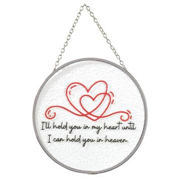 Hang this suncatcher in any window; sunlight filtering through the textured glass accentuates the colorful cardinal and the words "I'm Sending Love From Heaven." Finished with silver tone metal frame and hanging chain; clear suction cup included. Size is 6" diameter. Comes in a window box, all ready for gift giving.