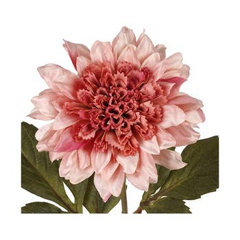 The Mauve Dahlia Stem is a decorative floral pick with a sturdy green stem. The stem has green leaf accents and features a single-bloom dahlia with layered petals in a romantic, vintage mauve pink color. Display this stem alone or alongside other greenery and florals for a charming touch to the home during Fall. Measures 24” high.