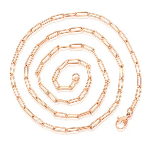 The curb chain necklace is crafted of stainless steel and has a high polished finish. The length of the necklace is 24 inches and has a width of 3/8 inches. The chain stays secure with a lobster claw clasp.