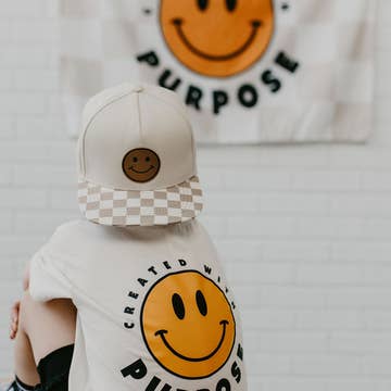 Created with purpose graphic tee Part of our infertility line, but designed with everyone in mind, created with purpose is a uplifting positive graphic tee. Printed on Bella canvas, front pocket logo reads Created with purpose, large back image with happy face in the center. TTS