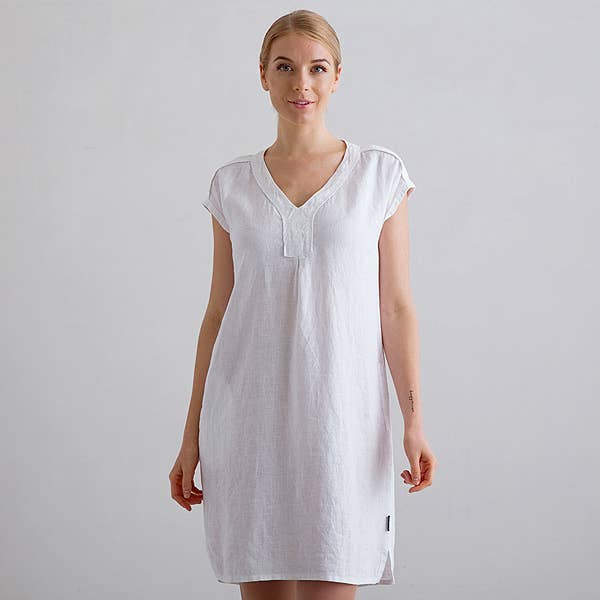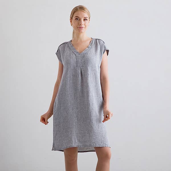 Simple yet pretty, the Emily linen dress is effortlessly beautiful. It looks as good dressed up with heels and a blazer as casually accompanied by sandals and a tote, and will outlast fleeting fashion fads. Two simple pockets, the v neck detail, short sleeves and single pleat at the back add an easy charm to this flattering dress.