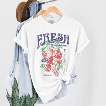 A summer best seller! 🍓 Growing + harvesting the goodness of the Fruit of the Spirit 🫐🍒 Printed on an off-white 100% Comfort Color tee Front: Strawberry patch in left corner Back: graphic across the back Summer Collection / Fruit Collection / Farmer Market Summer Graphics